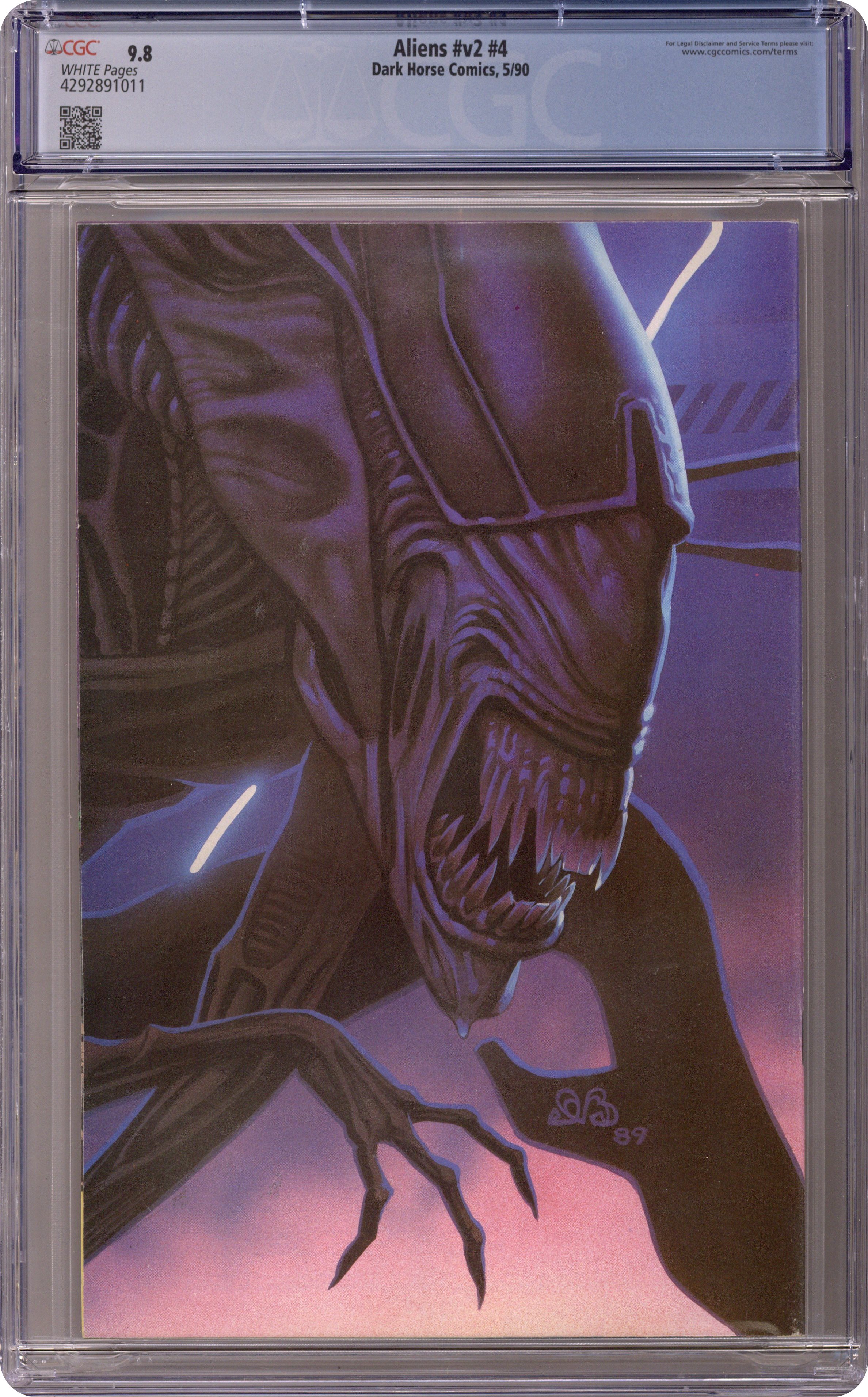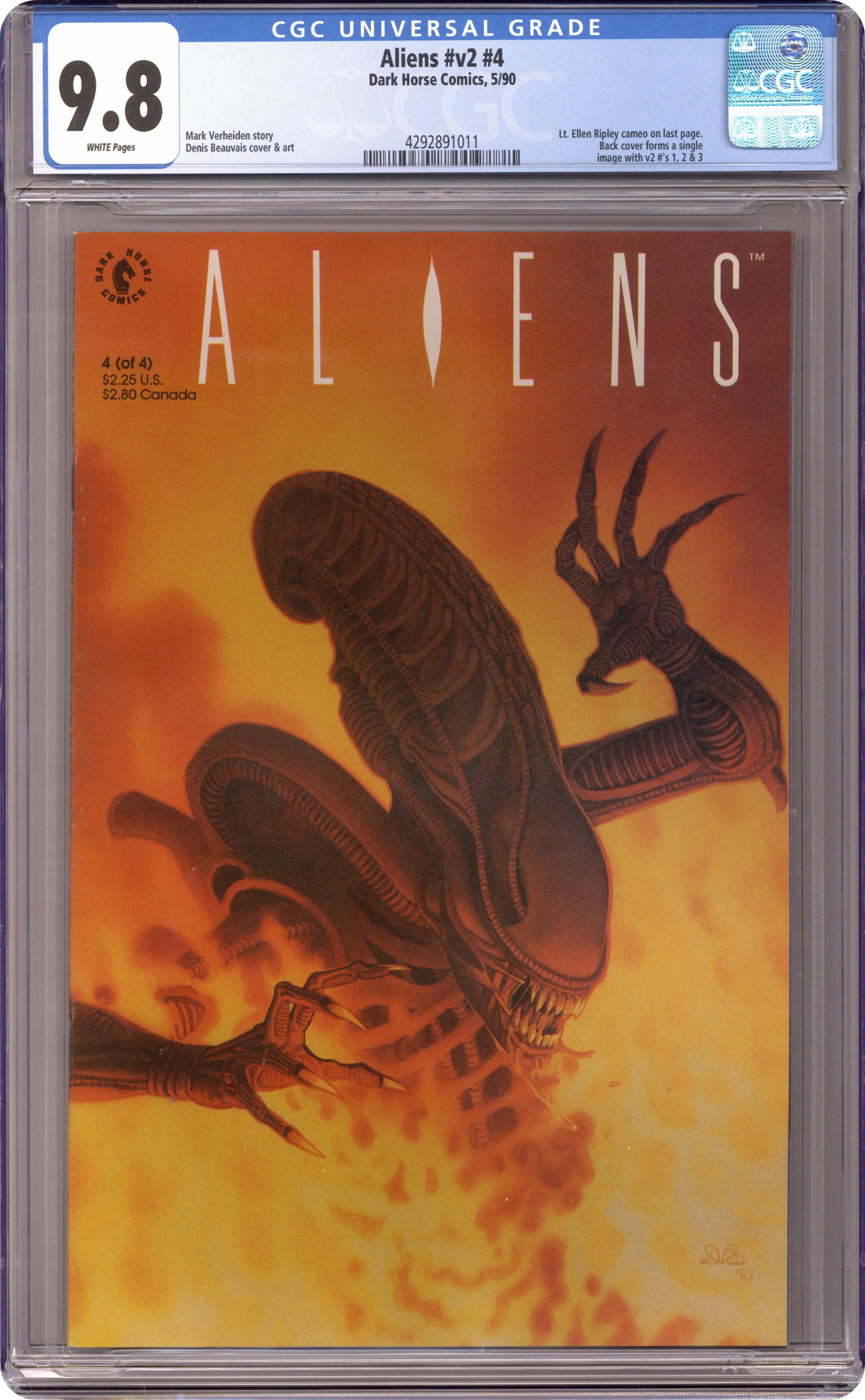 Written by Mark Verheiden. Art and cover by Denis Beauvais. Newt and Hicks join with the survivors of General Spear's army of Marines in a desperate attempt to reclaim the Earth from the Aliens, but it is an effort that seems to be doomed from the start! However, help comes from an unexpected quarter in this spectacular conclusion to one of the most popular miniseries of the year! FC Cover price $2.25. Grade: CGC 9.8 explanation of grade Condition: Used (collectible)