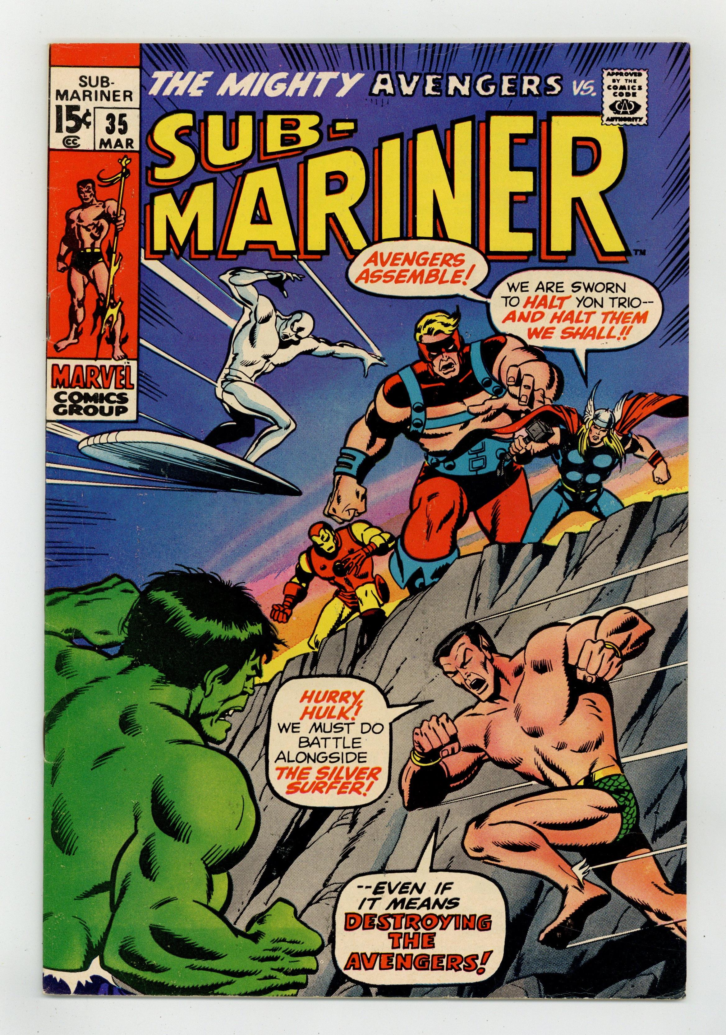 In this prelude to 1st Defenders story, "Confrontation!," Part 2 of 2 - Namor, the Hulk and the Silver Surfer team up to battle the Avengers in a storyline that hints that the three will be teaming up again. Story by Roy Thomas with Sal Buscema art and inks by Jim Mooney. Cover price $0.15. Grade: FN- 5.5 explanation of grade Condition: Used (collectible)
