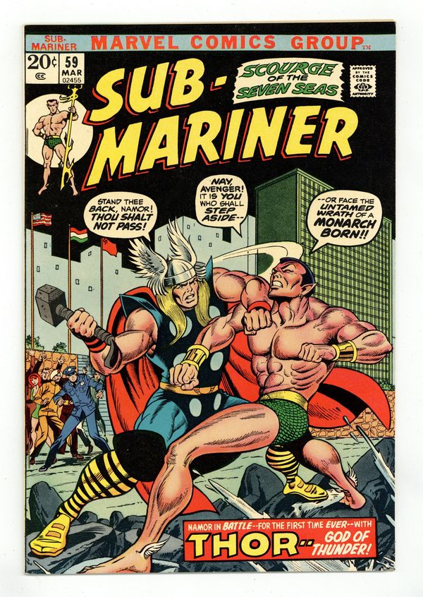 Ended Jan 10 2024 Winning Bid $35 Cover inks by Bill Everett and Marie Severin (alterations). "Thunder Over the Seas," script by Bill Everett and Steve Gerber, pencils by Sam Kweskin, inks by John Tartaglione; A pompous and arrogant Atlantean soldier, Lorvex, makes a pass at Tamara who rebukes his advances; She's later caught in a fishing net and eventually brought to New York city; Namor learns of her capture and makes his way there only to be challenged by Thor; Namor engages Thor and quickly learns the full power of the Thunder God; Namor returns home to ponder a full-scale invasion of the surface world. 36 pgs., full color. $0.20. Cover price $0.20. Grade: FN/VF 7.0 explanation of grade Condition: Used (collectible)