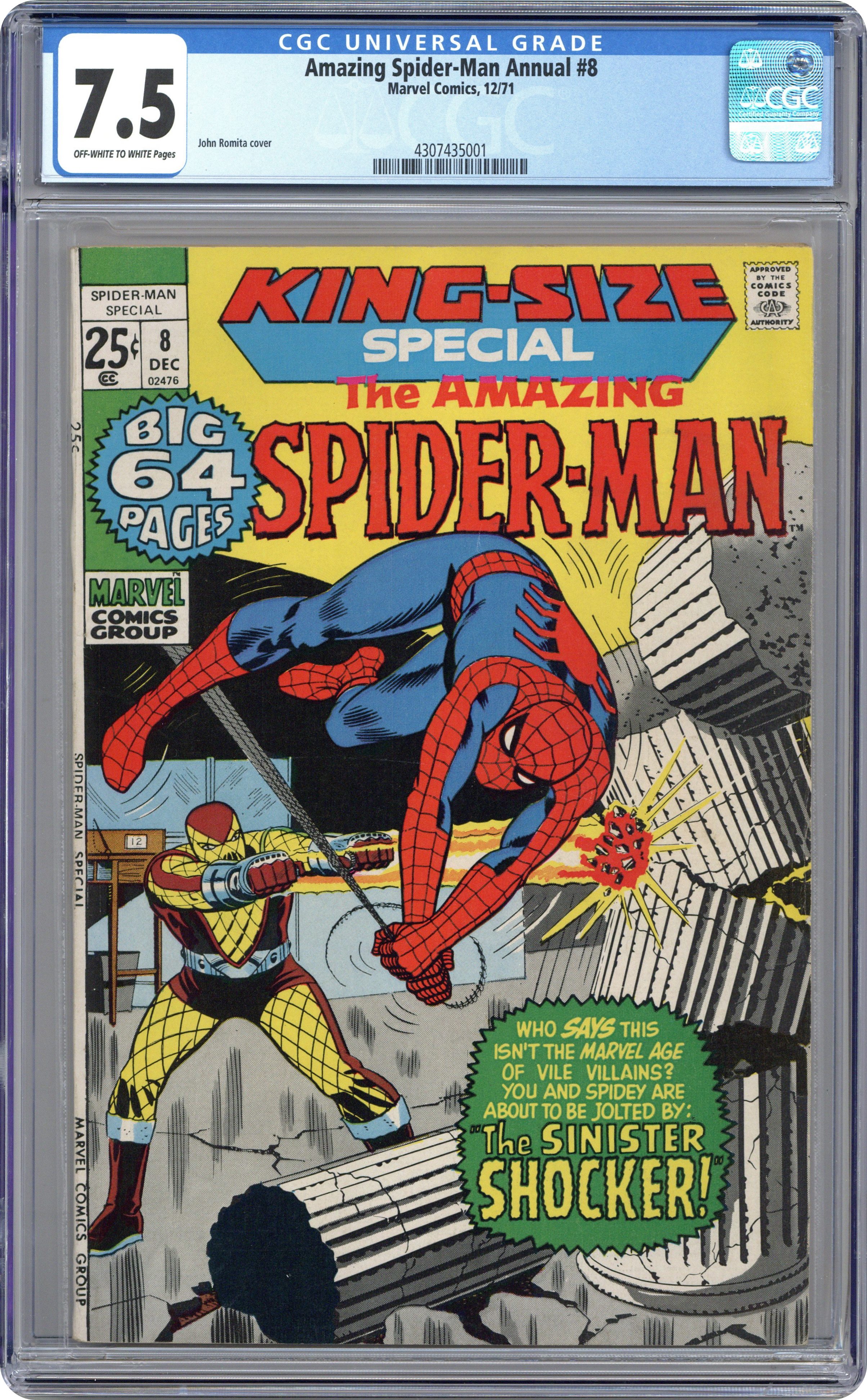 Ended Oct 6 2023 Winning Bid $24 This annual features three reprint stories and a reprinted cover by John Romita. First story and cover reprinted from Amazing Spider-Man 46: "The Sinister Shocker!" Script by Stan Lee. Art by John Romita. The wall-crawler meets the Shocker for the first time. (Note: Pages 3 and 16 from the original story are omitted.) Second story reprinted from Tales to Astonish 57: "On the Trail of Spider-Man!" Script by Stan Lee. Pencils by Dick Ayers. Inks by Paul Reinman. Egghead tricks Giant-Man and the Waspinto attacking Spider-Man. (Note: Pages 10 and 14 from the original story are omitted.) Third story reprinted from Amazing Spider-Man 50: "Spider-Man No More!" Script by Stan Lee. Pencils by John Romita. Inks by Mickey Dimeo (aka Mike Esposito). Peter gives up being Spider-Man, but later reconsiders when he remembers why he became the wondrous wall-crawler in the first place. Partial retelling of Spider-Man's origin. (Note: This annual was the first reprinting of the classic story in Amazing Spider-Man 50.) 68 pages. 25 cents. Cover price $0.25. Grade: CGC 7.5 explanation of grade Condition: Used (collectible)