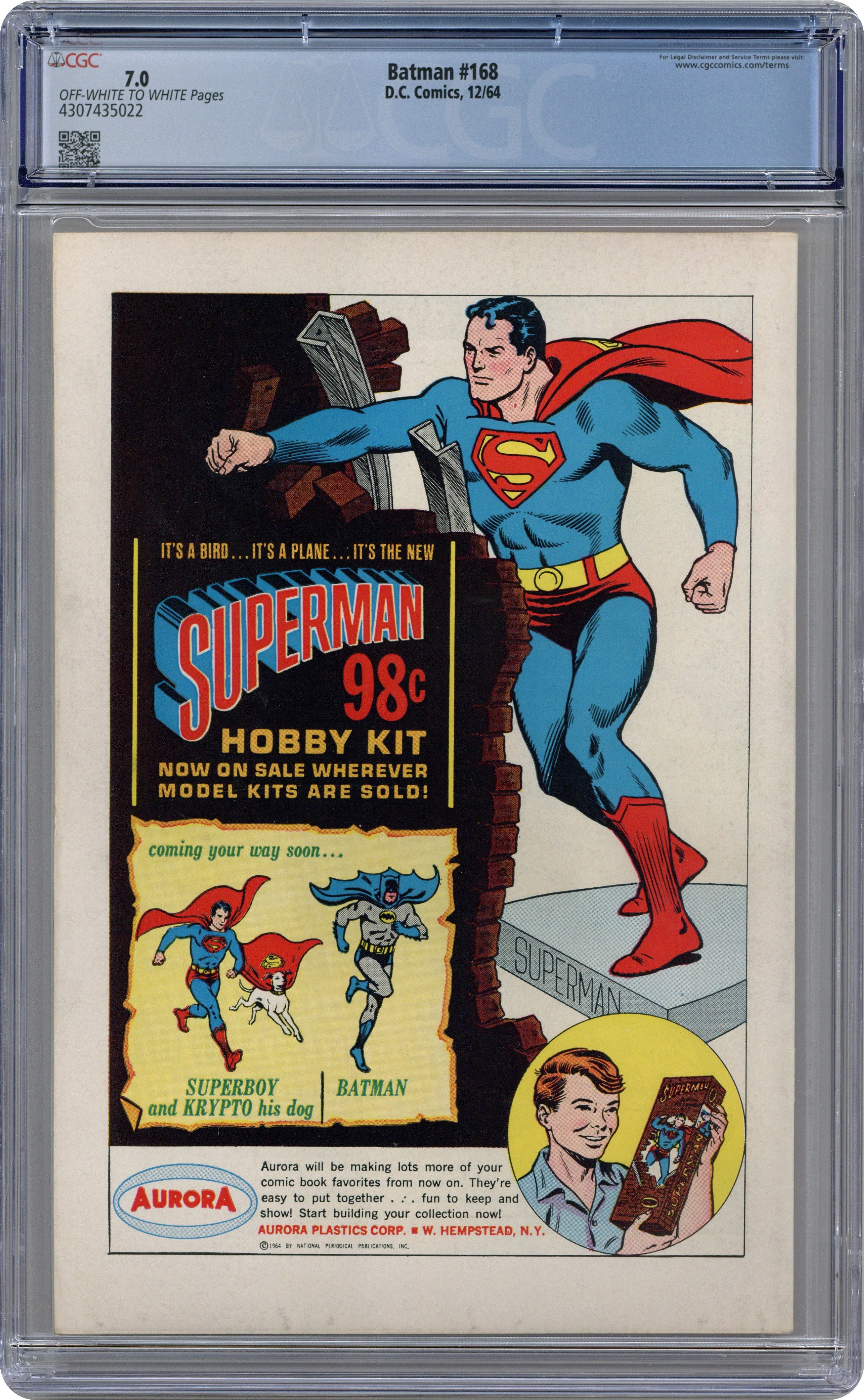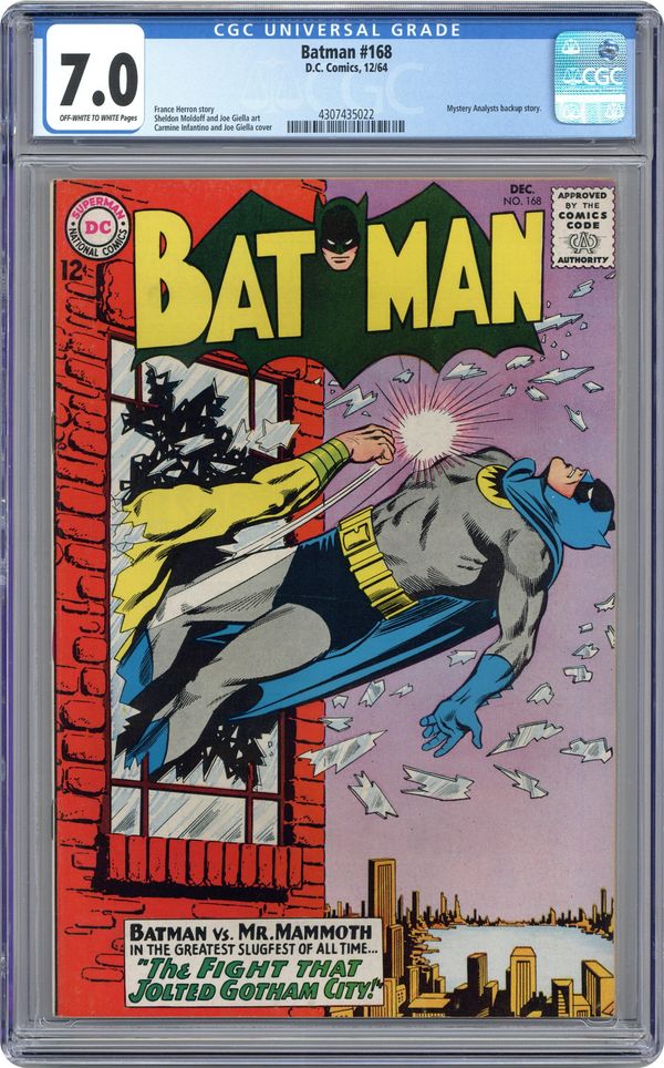 Ended Sep 25 2023 Winning Bid $138 Cover pencils by Carmine Infantino, inks by Joe Giella. "The Fight that Jolted Gotham City!", script by France Herron, pencils by Sheldon Moldoff, inks by Joe Giella; Batman helps cure a circus strong man of his wild mood swings by deducing that radio music tends to cause aggressive behavior in him. Cap's Hobby Center activity half-page by Henry Boltinoff. Crime-Writing Clues! non-fiction page. "How to Solve a Perfect Crime--In Reverse!", script by France Herron, pencils by Sheldon Moldoff, inks by Joe Giella; The Mystery Analysts split up to search for the thief who purloined a valuable diamond, and it's Batman who discovers that one member of the Analysts is the guilty party! Letter to the editor from comic writer Bob Rozakis. Rocky and Bullwinkle star in a one-page Cheerios ad. 36 Pages, Full Color. Cover price $0.12. Grade: CGC 7.0 explanation of grade Condition: Used (collectible)
