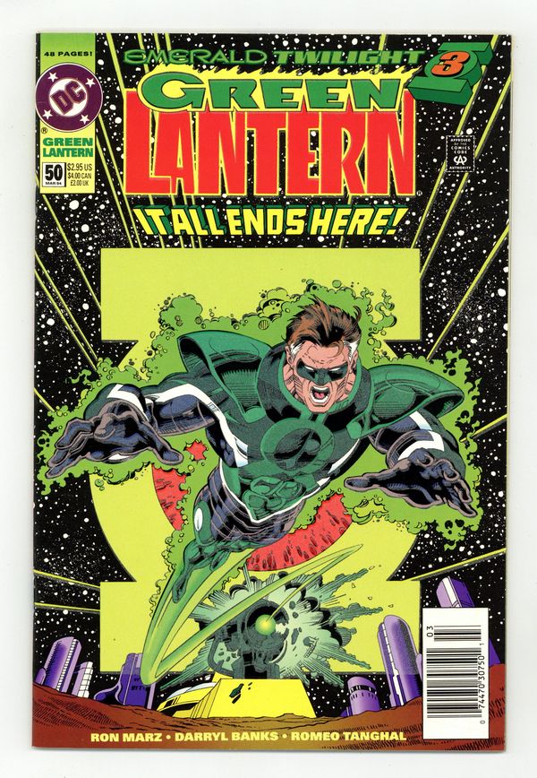Ended Sep 28 2023 Winning Bid $11 Newsstand Edition. Emerald Twilight: Part 3 of 3. "The Future!" Story by Ron Marz. Art by Darryl Banks and Romeo Tanghal. Don't miss the most startling conclusion of all. In order to stop a Hal Jordan who has gone mad with grief the Guardians of the Universe have unleashed the diabolical Sinestro, Hal's former mentor and greatest adversary. It's the final showdown - Hal Jordan vs. Sinestro to the death! Plus, the birth of a new hero and a new era in the life of Green Lantern. Things will never be the same again. Includes pin-ups of Green Lantern by Jeff Johnson and Terry Austin; Stuart Immonen and Karl Story; Tom Raney; Joe Phillips; Paul Pelletier and Mark Farmer; and Craig Hamilton. NOTE: 1st appearance of the Parallax and 2nd appearance of Kyle Rayner (1st appearance as Green Lantern). 52-page giant Cover price $2.95. Grade: VF 8.0 explanation of grade Condition: Used (collectible)