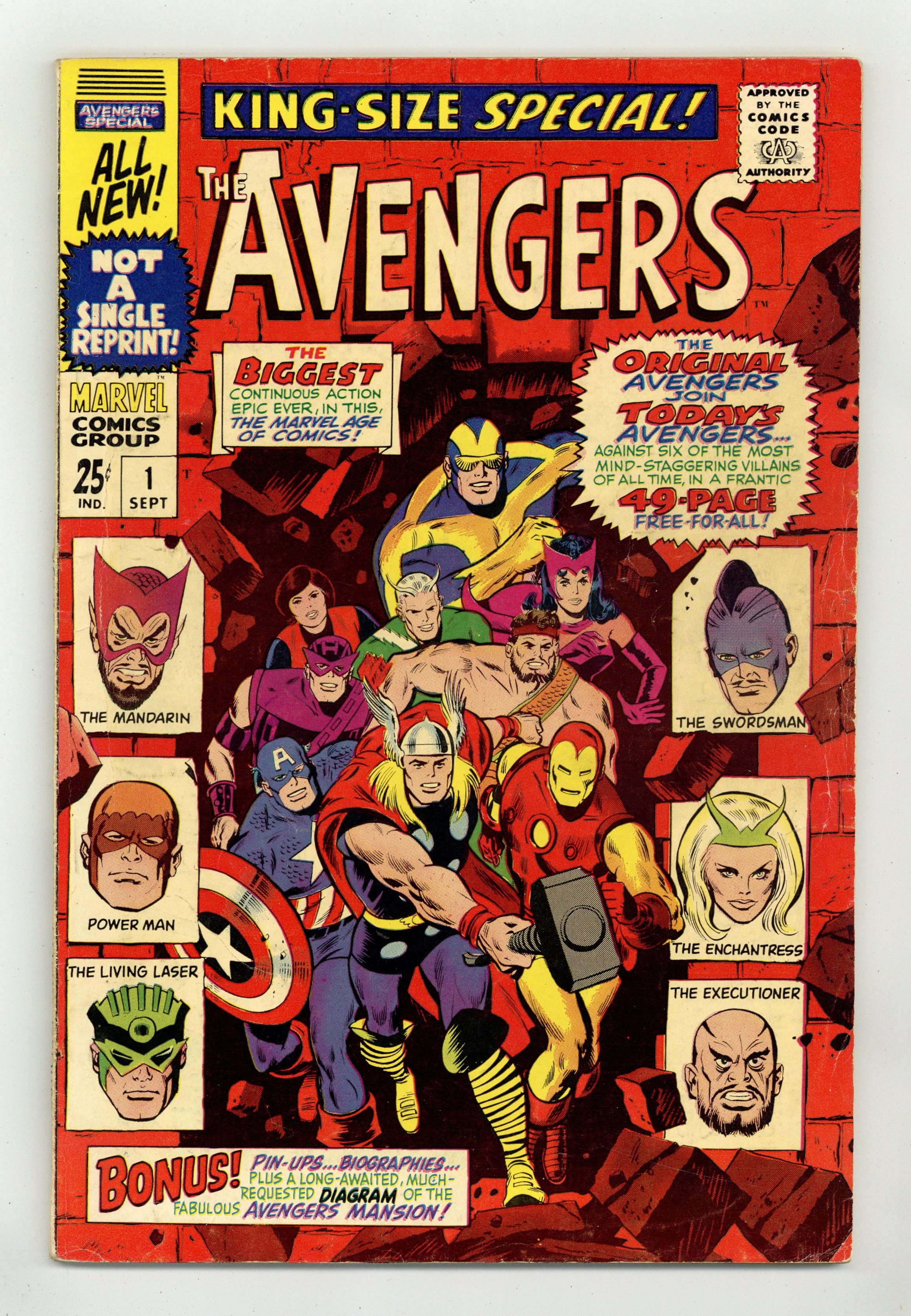 Ended Sep 28 2023 Winning Bid $30 "The Monstrous Master Plan of the Mandarin!" Script by Roy Thomas. Pencils by Don Heck. Inks by George Roussos (as George Bell). Cover by John Buscema and George Roussos (with John Romita touch-ups). The very first Avengers Annual is a blockbuster as the original team of avengers joins with the current team -- to battle six of their greatest foes! The Mandarin returns with a new scheme to conquer the world via a large synthetic diamond. However he needs help to accomplish his goal. So he sends his comrades in arms to three different continents to collect diamonds and wreak havoc! But Earth's Mightiest Heroes stand in their way! In South America Iron Man, Goliath, and the Wasp battle Power Man (aka Erik Josten) and the Swordsman! While in Asia Hercules and the Scarlet Witch clash with the Enchantress and the Executioner! And finally in Africa, Hawkeye and the thunder god face off with the Living Laser! But on the dark continent, the Mandarin has a special surprise waiting: the awesome android called Ultimo! Wow, Thor vs. Ultimo! A battle worth the cover price alone! Eventually, the full contingent of avengers meets the Mandarin inside his orbiting space station for the final showdown! A great annual! Cameo appearances by Jarvis and Nick Fury. Second feature: One-page pin-up of Hercules by Don Heck and George Roussos. Third feature: Two-page diagram of Avengers Mansion. Fourth feature: One-page pin-up of the Black Widow, Scarlet Witch, and Wasp by Don Heck and George Roussos. Fifth feature: One-page pin-up of all the avengers to date. Avengers Lineup: Captain America, Goliath, Hawkeye, Hercules, Iron Man, Quicksilver, Scarlet Witch, Thor, and the Wasp. (Note: This story takes place between Avengers (1st series) #44 and #45.) 68 pages. Cover price $0.25. Grade: VG+ 4.5 explanation of grade Condition: Used (collectible)