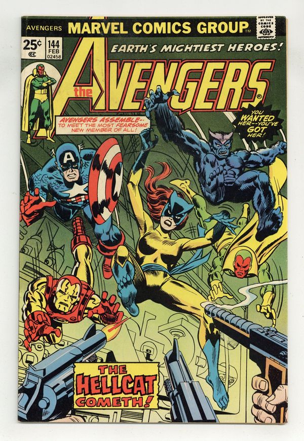 Ended Oct 2 2023 Winning Bid $23 "Claws!" Part 4 of 7. First appearance of Hellcat. Script by Steve Englehart. Pencils by George Perez. Inks by Mike Esposito. Cover by Gil Kane and Frank Giacoia. The Avengers are free inside the Brand Corporation's Long Island facility! However, it doesn't take long for Hugh Jones and Buzz Baxter to locate them and activate the plant's internal military-grade weapons! During the missile attack, the Avengers are forced to split up. The Beast, Vision, and Scarlet Witch go one way...and Captain America, Iron Man, and Patsy Walker go another! When Shell-head comes across the former uniform of the Cat, the shield-slinger gets an idea! And in a dazzling transformation...Patsy Walker becomes Hellcat! The Avengers could use another hero on their side, because the rematch with Doctor Spectrum, the Golden Archer, Hyperion, Lady Lark, and the Whizzer is coming up fast! An excellent issue! The story (part 5) continues in Avengers 147. Origin of Patsy Walker. Cameo appearances by the Two-Gun Kid, Hawkeye, Moondragon, and Thor. Flashback cameos by the Fantastic Four, Spider-Man, and Tigra. (Notes: The letters page includes letters from comics writer Peter Gillis and comics writer Mary Jo Duffy, respectively. The letters page also contains Marvel Value Stamp Series B #39 Thor by Jack Kirby.) 36 pgs. Cover price $0.25. Grade: VG 4.0 explanation of grade Condition: Used (collectible)