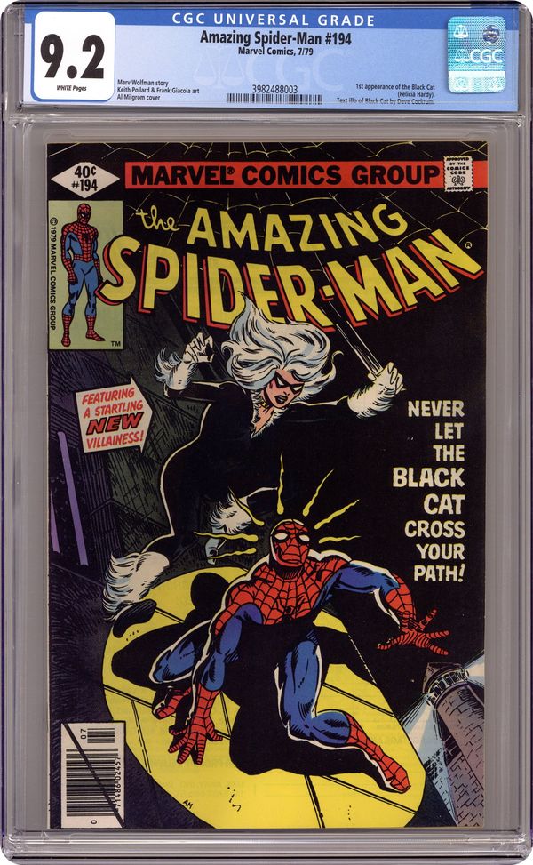 Direct Edition. First appearance of the Black Cat in "Never Let The Black Cat Cross Your Path!" Part 1 of 2. Script by Marv Wolfman. Art by Keith Pollard (breakdowns) and Frank Giacoia (finishes). Cover by Al Milgrom. One of the landmark issues of the Amazing Spider-Man series! The dazzling debut of the Black Cat! The wall-crawler has spent the first 193 issues of his title chasing super-villains! But tonight he's going to kiss one instead! Wow! Does the web-slinger stand a chance against the beauty and charm of Felicia Hardy? Not when the alluring cat has his tongue! And maybe later his heart! A terrific issue! Cameo appearances by Aunt May, Betty Brant, Ned Leeds, Harry Osborn, Flash Thompson, Mysterio (in civilian clothes), and the burglar. (Notes: The Black Cat is the creative highlight of the Wolfman-Pollard run on the Amazing Spider-Man title. Dave Cockrum designed the cat's costume. The letters page includes an alternate cover (for issue 194) by Keith Pollard. It also includes an alternate cover to Spider-Woman 9 by Carmine Infantino. This two-part story was reprinted in the trade paperback: Spider-Man vs. the Black Cat (2005). 36 pages, full color. Cover price $0.40. Grade: CGC 9.2 explanation of grade Condition: Used (collectible)