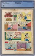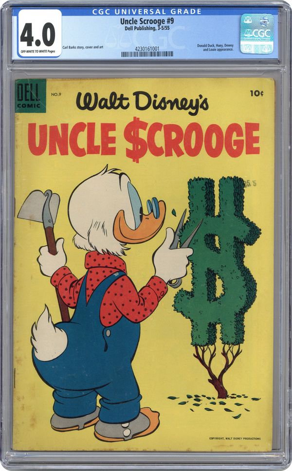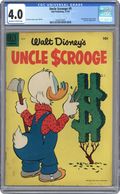 Cover by Carl Barks. Stories and art by Carl Barks. Comics legend Carl Barks creates his masterpiece, featuring the adventures of Donald Duck's Uncle Scrooge, the richest duck in the world. A lemming gets hold of the combination to Scrooge's new safe, and Scrooge must find it amongst the millions of lemmings marching to the sea. This Carl Barks story was adapted into an episode of the beloved 1980s Disney cartoon show "Duck Tales." Scrooge bets his weight in diamonds that his horse can beat the Maharajah of Swingingdore's tiger in a race. Scrooge shows Donald his money-saving lawnmower: a sheep. The Lemming With the Locket; The Tuckered Tiger. 32 pages, Full Color. Cover price $0.10. Grade: CGC 4.0 explanation of grade Condition: Used (collectible)