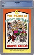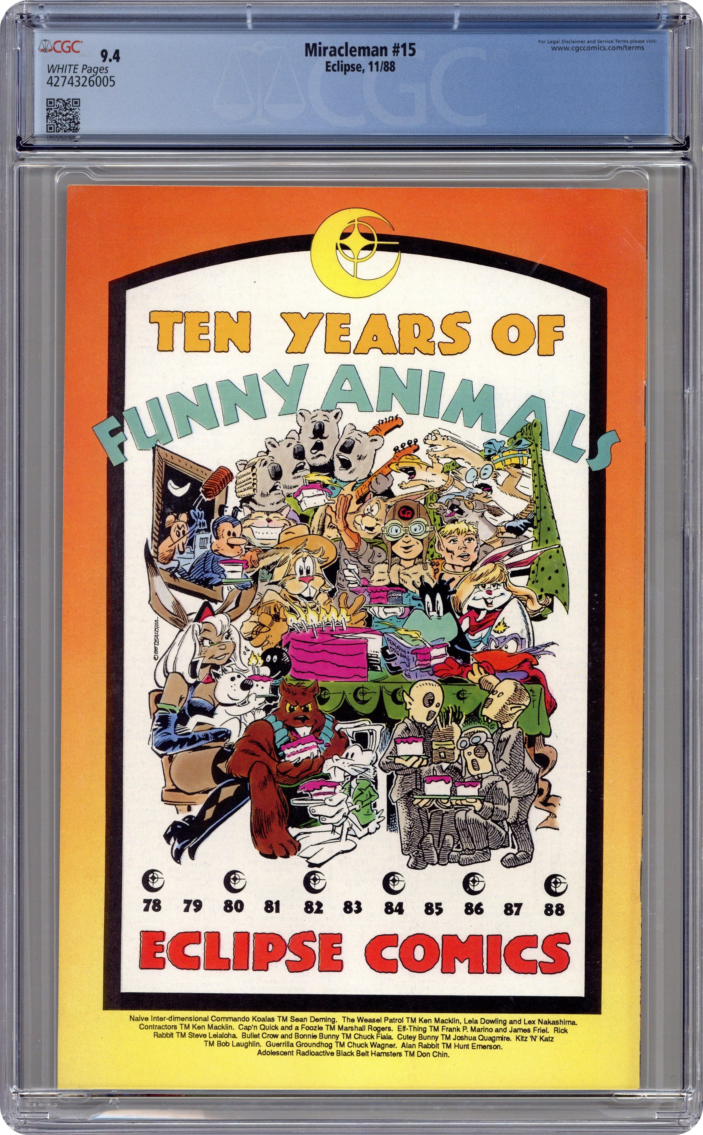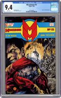 Alan Moore script, John Totleben art. "Book Three, Chapter Five: Nemesis." This sought-after issue features the end of Kid Miracleman and quite possibly the most horrific super-battle in the history of comics. Also features a five page back-up, "Miracleman and the Rock of Eternity," a reprint from Mic Anglo Studios' Amazing New Adventures of Marvelman #305 (circa 1955). Cover price $1.75. Grade: CGC 9.4 explanation of grade Condition: Used (collectible)