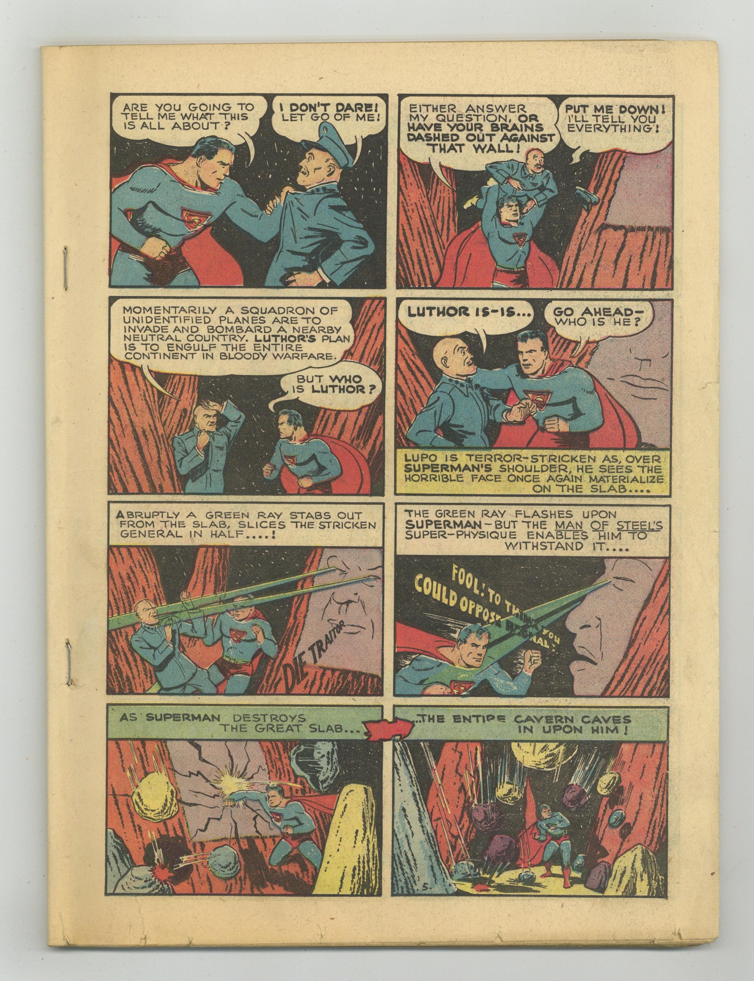 Ended Oct 25 2023 Winning Bid $1,111 Cover art by Joe Shuster and Paul Cassidy. Superman story, script by Jerry Siegel, art by Joe Shuster. Pep Morgan story, art by Fred Guardineer (as Gene Baxter). Black Pirate story, art by Sheldon Moldoff. Three Aces story, script by Gardner F. Fox, art by Chad Grothkopf. Tex Thomson story, art by Bernard Baily. Clip Carson story, art by Sheldon Moldoff. The Treasure Tower starring Zatara, script by Gardner F. Fox, art by Fred Guardineer. 68 Pages, Full Color. $.10 1st app of Lex Luthor (with red hair), 1st app of Black Pirate, 1st mention of Daily Planet instead of Daily Star, 1 panel ad for The Spectre in More Fun. Cover price $0.10. Grade: Coverless explanation of grade Condition: Used (collectible)