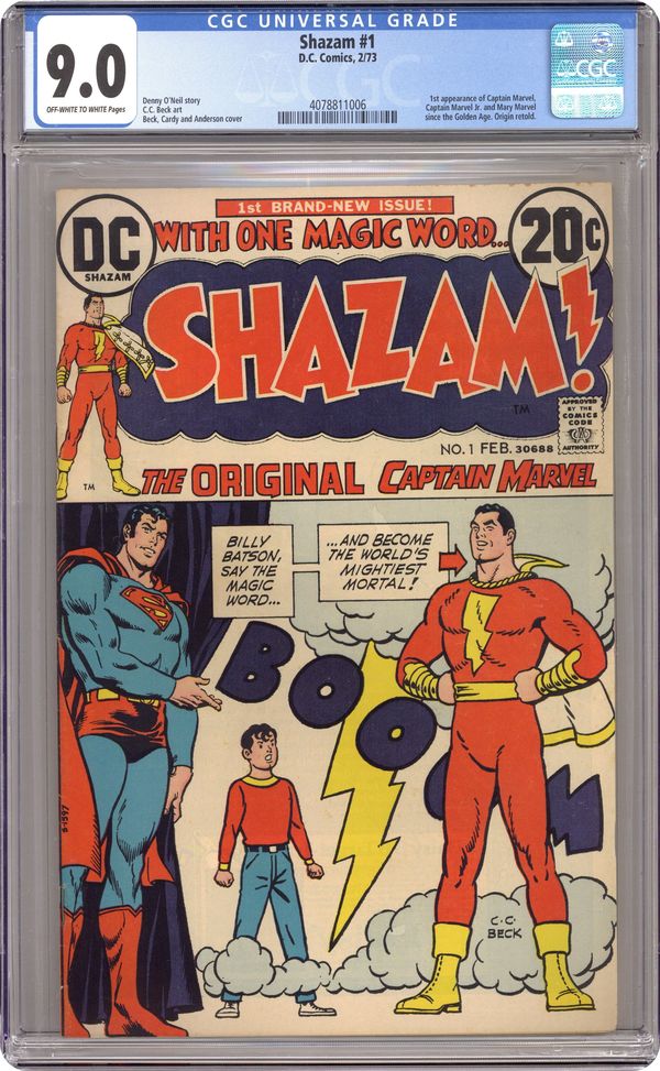 Ended Apr 2 2024 Winning Bid $74 Cover by C. C. Beck, Nick Cardy, and Murphy Anderson. ...In the Beginning ..., script by Denny O'Neil, art by C. C. Beck; After missing for 20 years, Captain Marvel returns to Earth; Origin retold. The World's Wickedest Plan, script by Denny O'Neil, art by C. C. Beck; Captain Marvel escapes the trap that Dr. Sivana had created that caused the Marvel Family to be placed in suspended animation for the last 20 years. Reprint back-up: "The Endless String" (from Captain Marvel Adventures 55 in 1946), written by Otto Binder, art by Pete Costanza. One-page text feature by E. Nelson Bridwell--a history of Captain Marvel. 36 pgs., full color. $0.20. Cover price $0.20. Grade: CGC 9.0 explanation of grade Condition: Used (collectible)