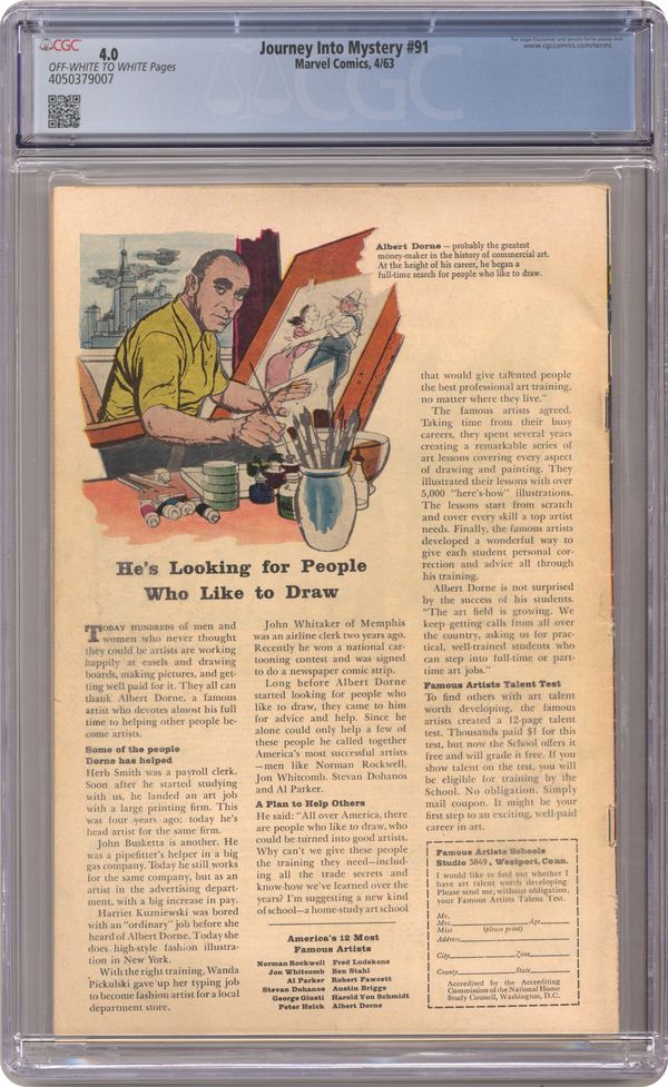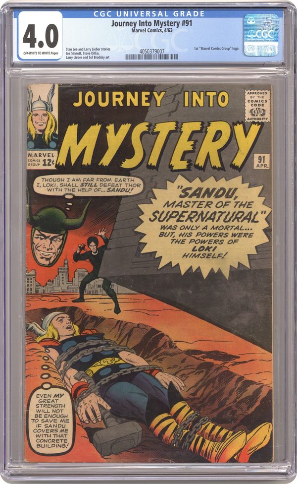 Cover pencils by Jack Kirby, inks by Dick Ayers. "Sandu, Master of the Supernatural!", script by Stan Lee (plot) and Larry Lieber (script), art by Joe Sinnott; Loki gives a greedy carnival mystic magical powers in order to use him to attack Thor; Thor is overcome in their first battle, but with the help of Odin and his belt of strength he defeats Loki's pawn; Jane Foster appearance; first appearance of Odin's Valkyries (cameo). "The Party" text story. "The Seedlings," script by Stan Lee (plot) and Larry Lieber (script), pencils by Larry Lieber, inks by Sol Brodsky; Alien spores land on Earth and bloom into telepathic plants that would have conquered the world had they not been eaten by crows. "The Manikins!", script by Stan Lee, art by Steve Ditko; An odd man works with the manikins in a department store, but becomes upset when one of the female manikins is to be put in a bridal display; The employee disappears and the groom is replaced with a manikin that looks just like him. 36 pgs., full color. Cover price $0.12. Grade: CGC 4.0 explanation of grade Condition: Used (collectible)