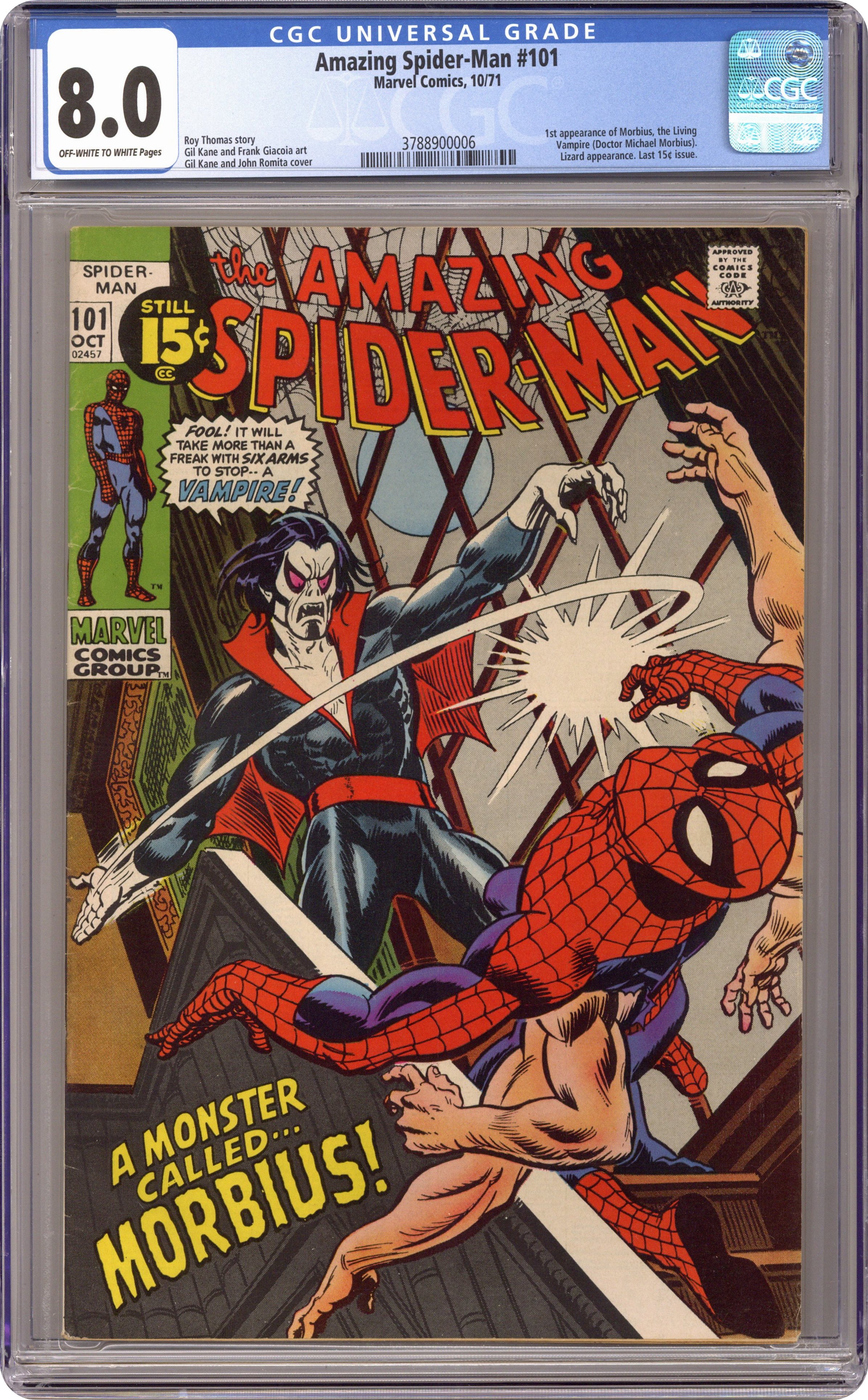 Ended Jan 25 2024 Winning Bid $626 First appearance of Morbius the Living Vampire in "A Monster Called Morbius!" Script by Roy Thomas. Pencils by Gil Kane. Inks by Frank Giacoia. Cover by Gil Kane and John Romita. The first 100 issues of the Amazing Spider-Man title are in the books! And the next chapter in the web-slinger's anthology kicks off with the debut of Marvel's first bronze age vampire: Morbius! However, at the moment Peter Parker has a much bigger problem on his (six) hands. After drinking the special potion he developed, Aunt May's nephew grew four additional arms! Oh, my goodness! Peter is desperate to find a way to remove the arms, so he calls Dr. Curt Connors for help. Dr. Connors has a summer house and laboratory in Southampton on Long Island...and he gives Spider-Man permission to stay there and work on a cure. Meanwhile, a strange, pale, and bloodthirsty man is the sole survivor of a shipwreck near Southampton. And he's looking for a quiet place to rest. Oh no. Is the six-armed Spider-Man on a collision course with a living vampire? Oh yes! Cameo appearances by Gwen Stacy, J. Jonah Jameson, Joe Robertson, and the Lizard. Last 15ยข cover price. (Notes: This is the first issue of the Amazing Spider-Man series not written by Stan Lee. There exists a second printing of this issue published in 1992 with a silver background cover. Marvel also published a facsimile edition of Amazing Spider-Man 101 in 2021.) 36 pages. Cover price $0.15. Grade: CGC 8.0 explanation of grade Condition: Used (collectible)