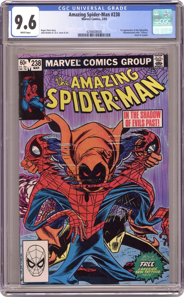 Ended Mar 4 2024 Winning Bid $500 IMPORTANT: Issue 238A HAS the Lakeside Skin Tattooz insert. Direct Edition. First appearance of the Hobgoblin in "Shadow of Evils Past!" Script by Roger Stern. Art by John Romita Jr. (breakdowns) and John Romita Sr. (finishes). Cover by John Romita Jr. and John Romita Sr. One of the landmark issues of the Amazing Spider-Man! And the beginning of the long secret identity mystery of the Hobgoblin! After escaping from the web-slinger, a bank robber stumbles upon an underground hideout of the (deceased) Green Goblin! Not knowing what to do with his discovery, the small-time hood shows the secret lair to an underworld associate! Unfortunately for the wondrous wall-crawler, the devious associate knows exactly what to do: resurrect the Green Goblin...with a twist! And a short time later a new super-villain is born! The Hobgoblin! Cameo appearance by Mary Jane Watson. Flashback cameo by Norman Osborn (aka the Green Goblin). (Notes: The secret identity of the original Hobgoblin takes many twists and turns over the next decade. Who actually operates as the Hobgoblin in this issue is revealed in the Spider-Man: Hobgoblin Lives (1997) Limited Series (written by Roger Stern). This issue was reprinted in Marvel Tales 257 and also in the 1992 trade paperback: the Amazing Spider-Man -- Origin of the Hobgoblin.) 36 pages. Cover price $0.60. Grade: CGC 9.6 explanation of grade Condition: Used (collectible)