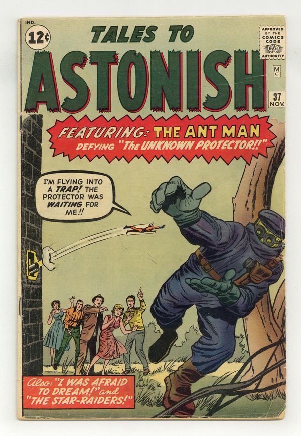 Ended Oct 13 2023 Winning Bid $51 Cover by Jack Kirby and Dick Ayers. Trapped by the Protector! Part 1, script by Stan Lee and Larry Lieber, art by Jack Kirby and Dick Ayers; Ant-Man deals with a dangerous extortionist, who turns out to be disguised as one of the victimized jewelers. [Trapped by the Protector!, Part 2:] Face-to-Face With the Protector!, script by Stan Lee and Larry Lieber, art by Jack Kirby and Dick Ayers. The Magician text story. Afraid to Dream!, art by Don Heck; A man whose dreams come true is terrified when he dreams his own death. The Star Raiders, script by Stan Lee, art by Steve Ditko; A group of escaped convicts turned pirates are tricked into attacking a planet they believe defenseless by a man who claims the inhabitants are midgets neglecting to mention that they are only midgets compared to him. 36 pgs., full color. $0.12. Cover price $0.12. Grade: GD/VG 3.0 explanation of grade Condition: Used (collectible)