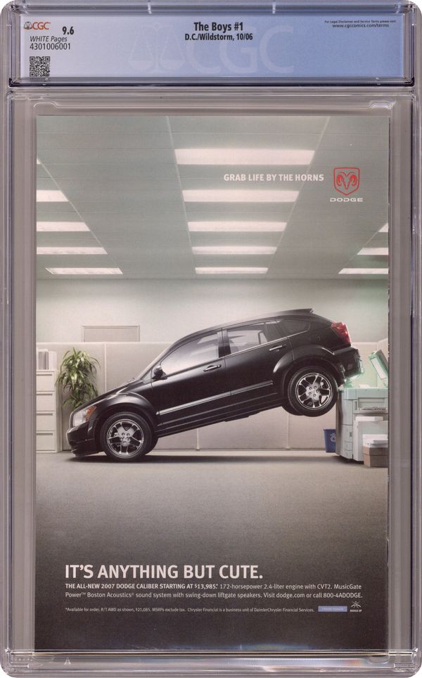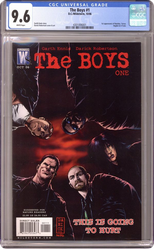 Written by Garth Ennis. Art and covers by Darick Robertson. 'This book will out-PREACHER PREACHER.' - Garth Ennis (Preacher) and Darick Robertson (Transmetropolitan), co-creators of two of the most thought-provoking comics of the last decade, introduce their first original collaboration for a new monthly series: THE BOYS - a dark, twisted look at super powers, super-people, and the men and women who make sure the world's 'heroes' never go too far. With a quarter-million super-powered beings in the world, someone's got to watch what's going on beneath all those masks and capes. In a U.S.A. uncomfortably like our own, that task falls to The Boys, a government-funded group of operatives dedicated to keeping the 'supes' in line. Team leader Billy Butcher, described by a confidential C.I.A. report as 'the most lethal individual ever encountered by this agency,' is on the hunt for new recruits - but it takes something special to join this outfit. You have to be smart. You have to be strong. And you have to hate supes with every ounce of black passion in your heart. Cover price $2.99. Grade: CGC 9.6 explanation of grade Condition: Used (collectible)