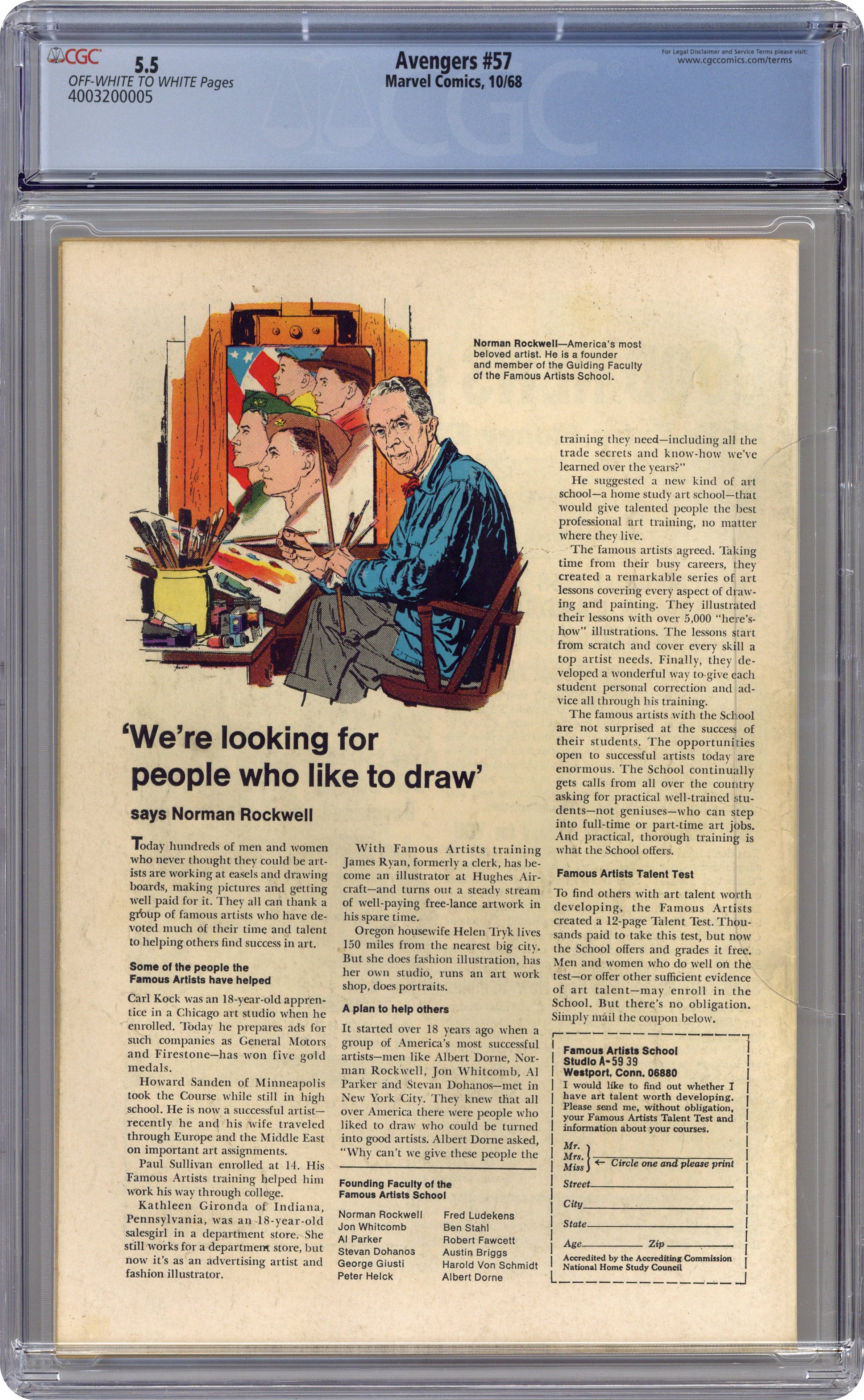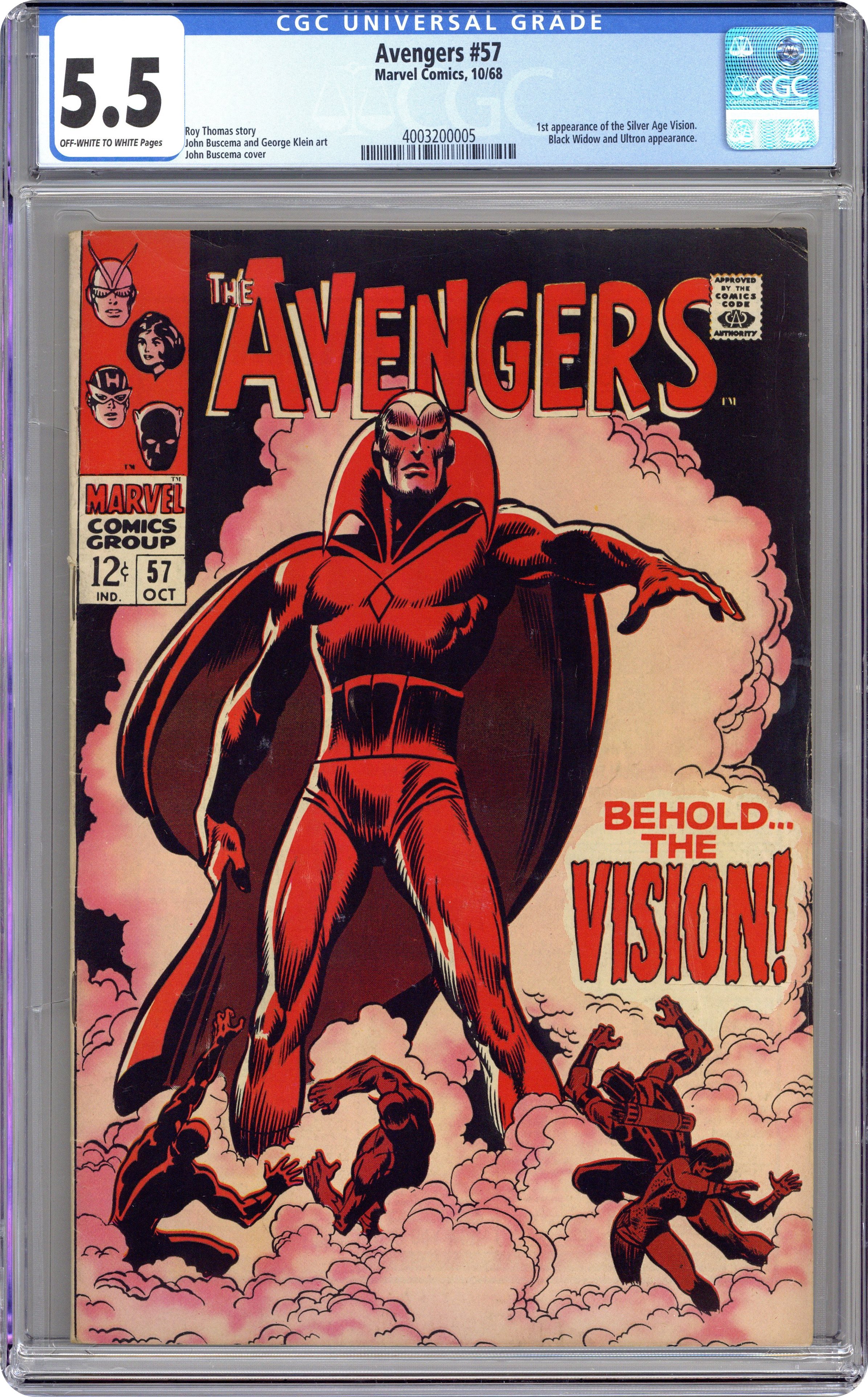 Ended Jan 19 2024 Winning Bid $260 First appearance of the Vision in "Behold...the Vision!" Part 1 of 2. Script by Roy Thomas. Pencils by John Buscema. Inks by George Klein. Cover by John Buscema and George Klein. One of the landmark issues of the silver age! On a rainy night in Manhattan, a strange being enters Janet Van Dyne's apartment and suddenly collapses! The Wasp quickly calls Goliath; and they take the red-hued stranger to Avengers Mansion for examination! Once their Hank Pym discovers that the Vision is a human being constructed of synthetic materials - a synthezoid in fact! When the Vision wakes up, he remembers that Ultron sent him to destroy the Avengers! But now the Vision wants to flip the script on his creator! So he leads Earth's Mightiest Heroes back to Ultron's underground lair! Could this be a trap? Either way Ultron-5 is waiting! And the battle is coming! Will the Vision prove worthy of the Avengers' trust? Cameo appearance by the Black Widow. Avengers Lineup: Black Panther, Goliath, Hawkeye, and the Wasp. (Notes: The synthezoid avenger is not to be confused with the golden age Vision (aka Aarkus). Marie Severin contributed pencils to page 3 - the second to last panel. The letters page includes a letter from comics writer Tony Isabella. This issue was reprinted in Marvel Treasury Edition (1974) #7 and also in Marvel Super Action #18.) 36 pages. Cover price $0.12. Grade: CGC 5.5 explanation of grade Condition: Used (collectible)