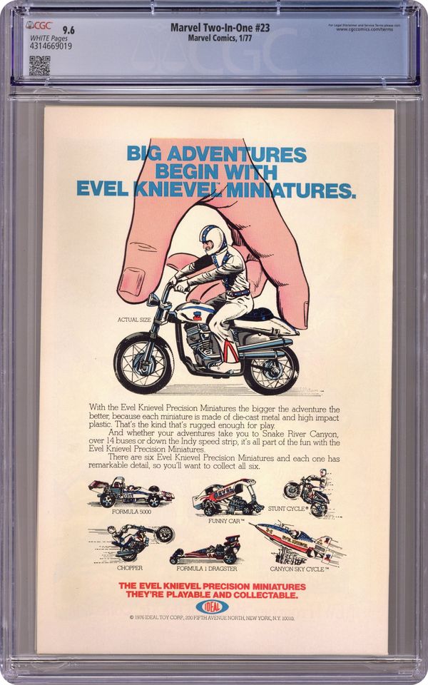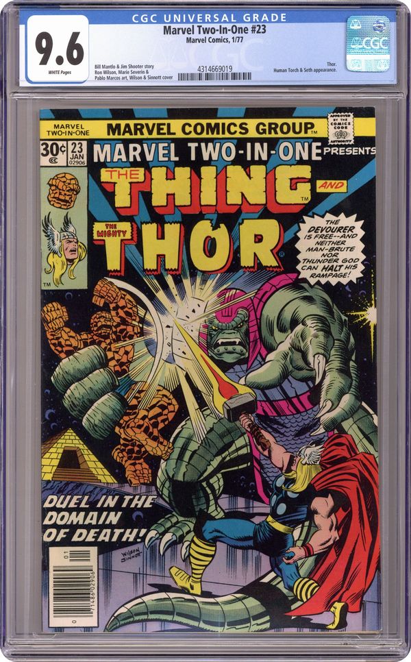 "Death on the Bridge to Heaven!" Part 3 of 3. Guest-starring Thor and the Human Torch. Story by Bill Mantlo and Jim Shooter. Art by Ron Wilson, Marie Severin, and Pablo Marcos. Seth, the Egyptian God of Death, has unleashed the monstrosity known as the Devourer, and not even the man-brute strength of the Thing and the power of Thor, the Thunder God, may be enough to stop it. Cover price $0.30. Grade: CGC 9.6 explanation of grade Condition: Used (collectible)