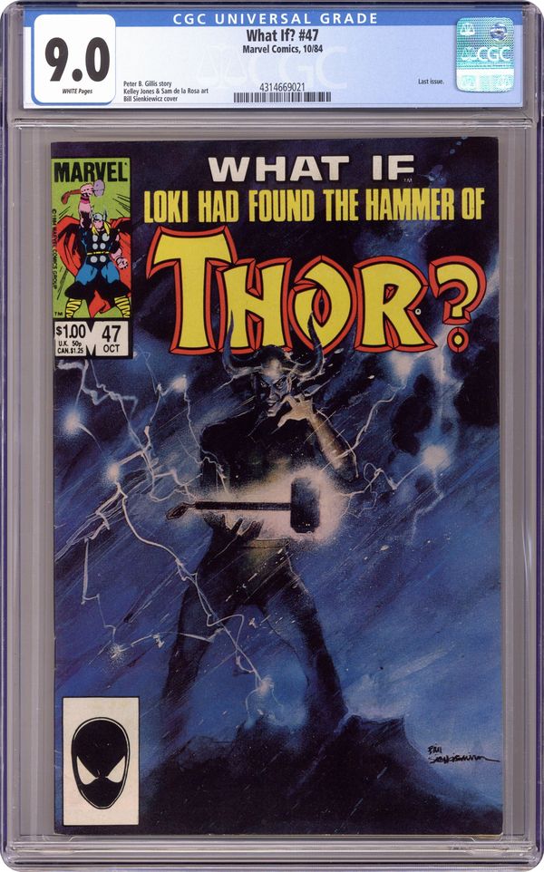 Ended Oct 30 2023 Winning Bid $31 "What If Loki Found Thor's Hammer First?" Script by Peter Gillis, pencils by Kelley Jones, inks by Sam DeLa Rosa. Bill Sienkiewicz cover. 52 pgs. Cover price $1.00. Grade: CGC 9.0 explanation of grade Condition: Used (collectible)