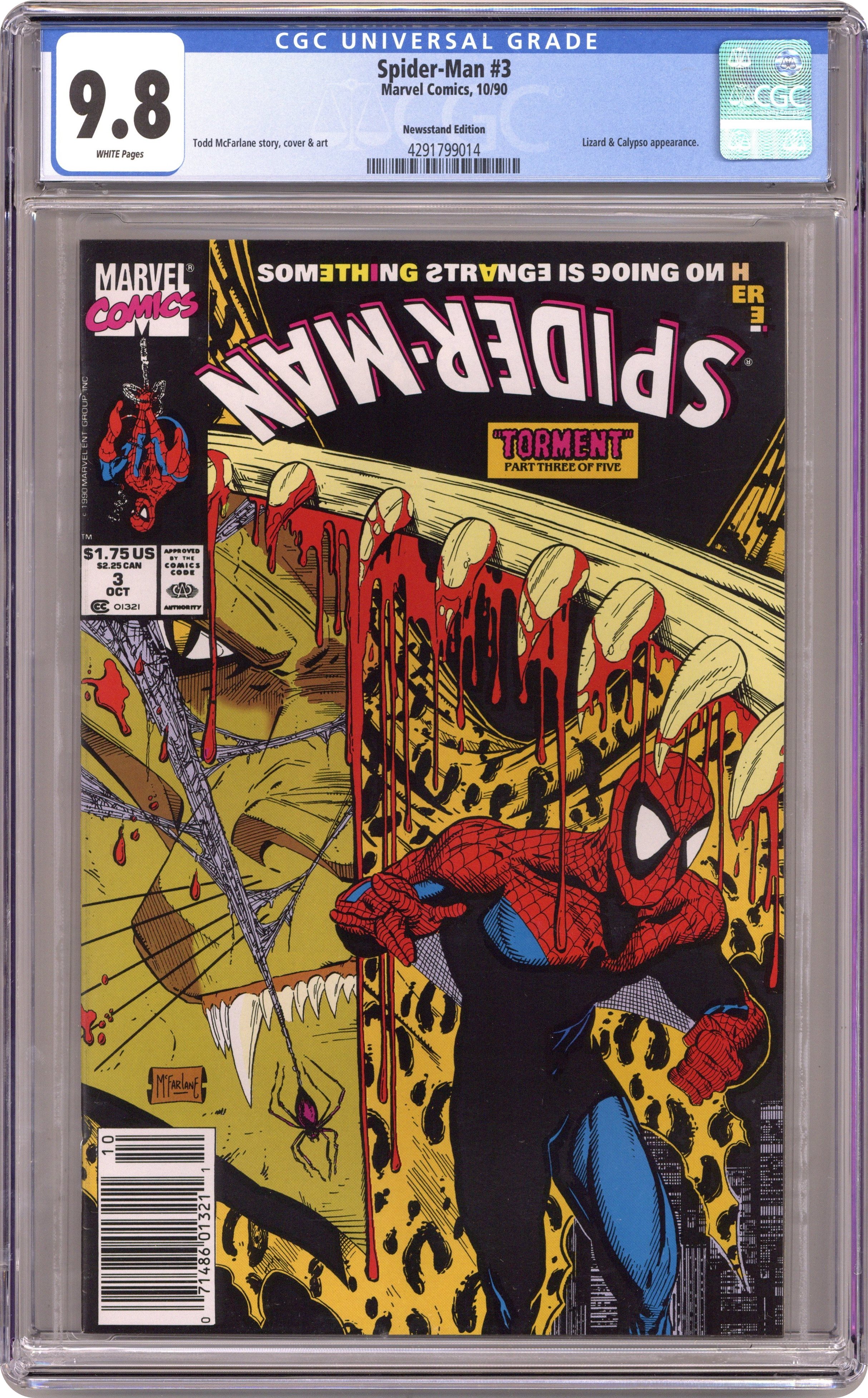 Newsstand Edition. Torment Part 3 of 5. "Something Strange is Going on Here!" Script and art by Todd McFarlane. Cover by Todd McFarlane. The Amazing Spider-Man and the Lethal Lizard wage war across the rooftops of Manhattan! Until the mysterious drums halt their fight! Who is controlling the pounding drums? The web-slinger better find out soon...or he won't make it through the night in one piece! Cameo appearance by Mary Jane Watson. (Note: This five-part story was reprinted in 1992 in the trade paperback: Spider-Man Torment; and again in 2009 in hardcover format.) 32 pages. Cover price $1.75. Grade: CGC 9.8 explanation of grade Condition: Used (collectible)