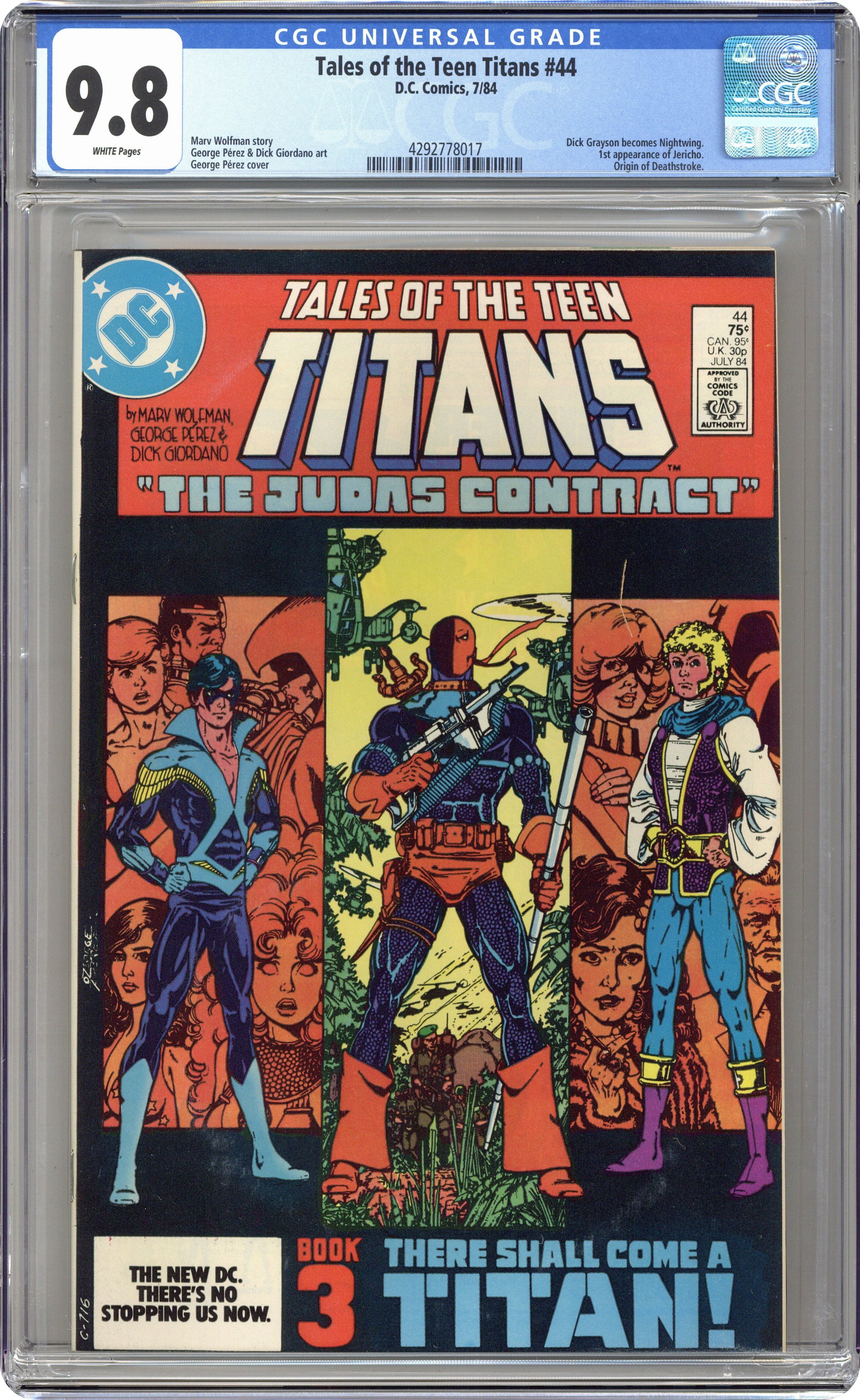 Ended Oct 13 2023 Winning Bid $282 Direct Edition. The Judas Contract: Part 3 of 4: There Shall Come a Titan! - Written by Marv Wolfman & George Perez. Art by George Perez, Dick Giordano and Mike DeCarlo. Cover by George Perez. Adeline Wilson tells Dick Grayson of the origin of Deathstroke, and Dick assumes the name Nightwing for the first time! Starring Nightwing (intro), Jericho (intro), Deathstroke the Terminator, Terra, Adeline Wilson, H.I.V.E., Wintergreen, Grant Wilson (flashback/cameo) and Jackal. Concludes in New Teen Titans (1980) Annual #3. 36 pages, full color. Cover price $0.75. Grade: CGC 9.8 explanation of grade Condition: Used (collectible)