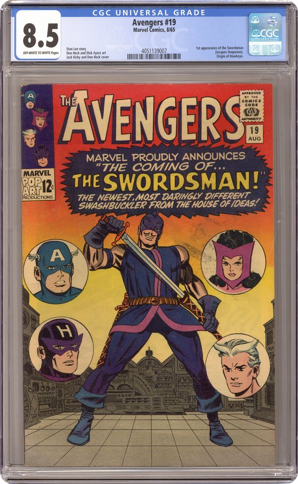 Cover pencils by Jack Kirby and Don Heck (insets), inks by Frank Giacoia. First appearance of the Swordsman and the origin of Hawkeye in "The Coming of... the Swordsman!", script by Stan Lee, pencils by Don Heck, inks by Dick Ayers; The Swordsman infiltrates the Avenger's base and Scarlet Witch and Quicksilver attack him; He then admits he was testing them and wants to apply for membership; Captain America intervenes with information saying he is a wanted man and the Swordsman escapes; Hawkeye explains that the Swordsman used to be his tutor when he was in the circus; Meanwhile, in Nick Fury's office in Washington D.C HYDRA agents find a letter from Captain America; They later discard it as trash; It explained how Captain America wanted to work for S.H.I.E.L.D.; A mobster finds it and gives it to the Swordsman; A trap is laid for Captain America; He then leaves to meet with "Nick Fury"; Hawkeye finds out about the plan and gathers the other Avengers to help him; Captain America battles the Swordsman and gets captured before the others can arrive to help. Avengers Roll Call: Captain America, Hawkeye, Quicksilver, and the Scarlet Witch. Letter to the editor from Cary Burkett. 36 pgs., full color. $0.12. Cover price $0.12. Grade: CGC 8.5 explanation of grade Condition: Used (collectible)