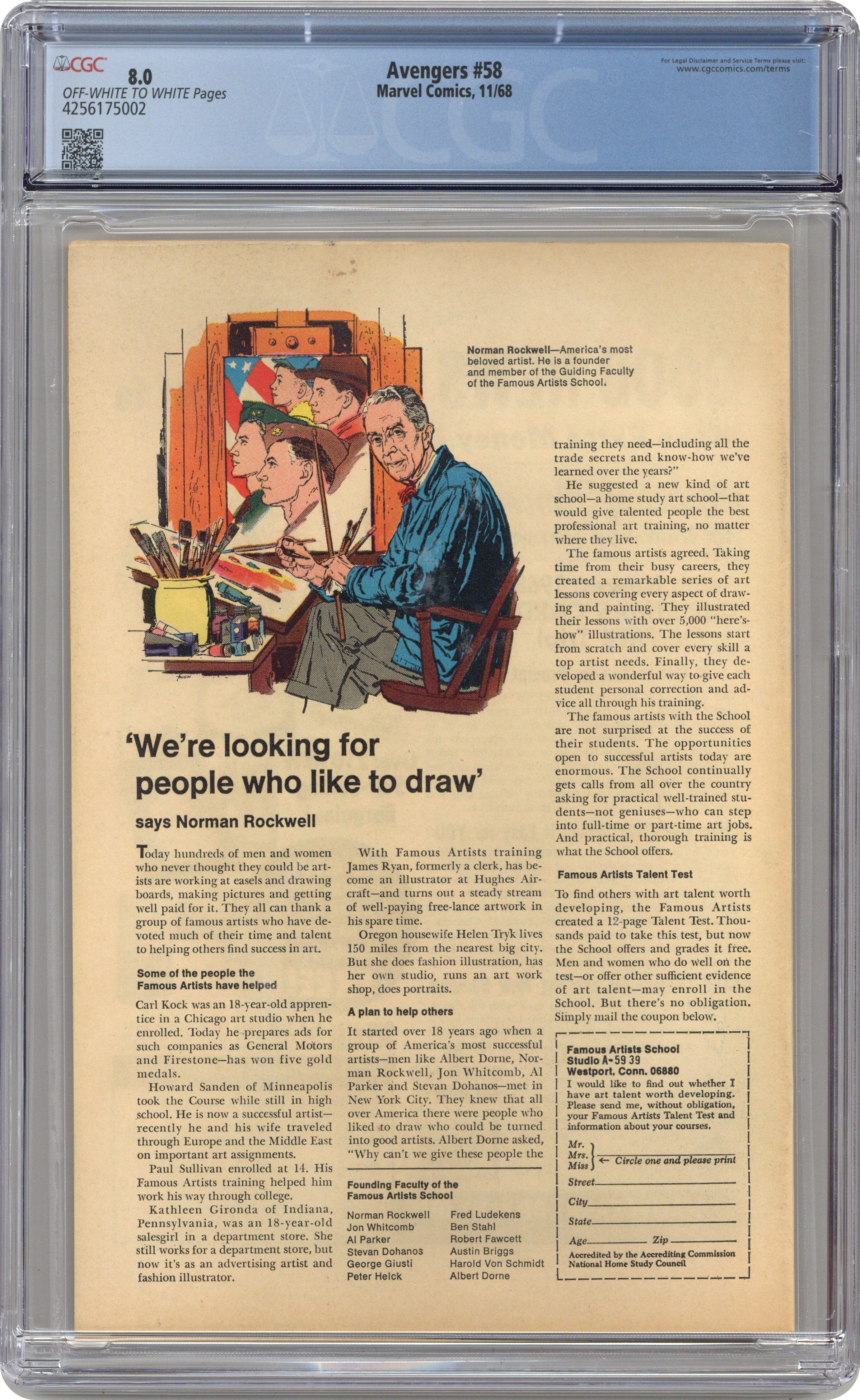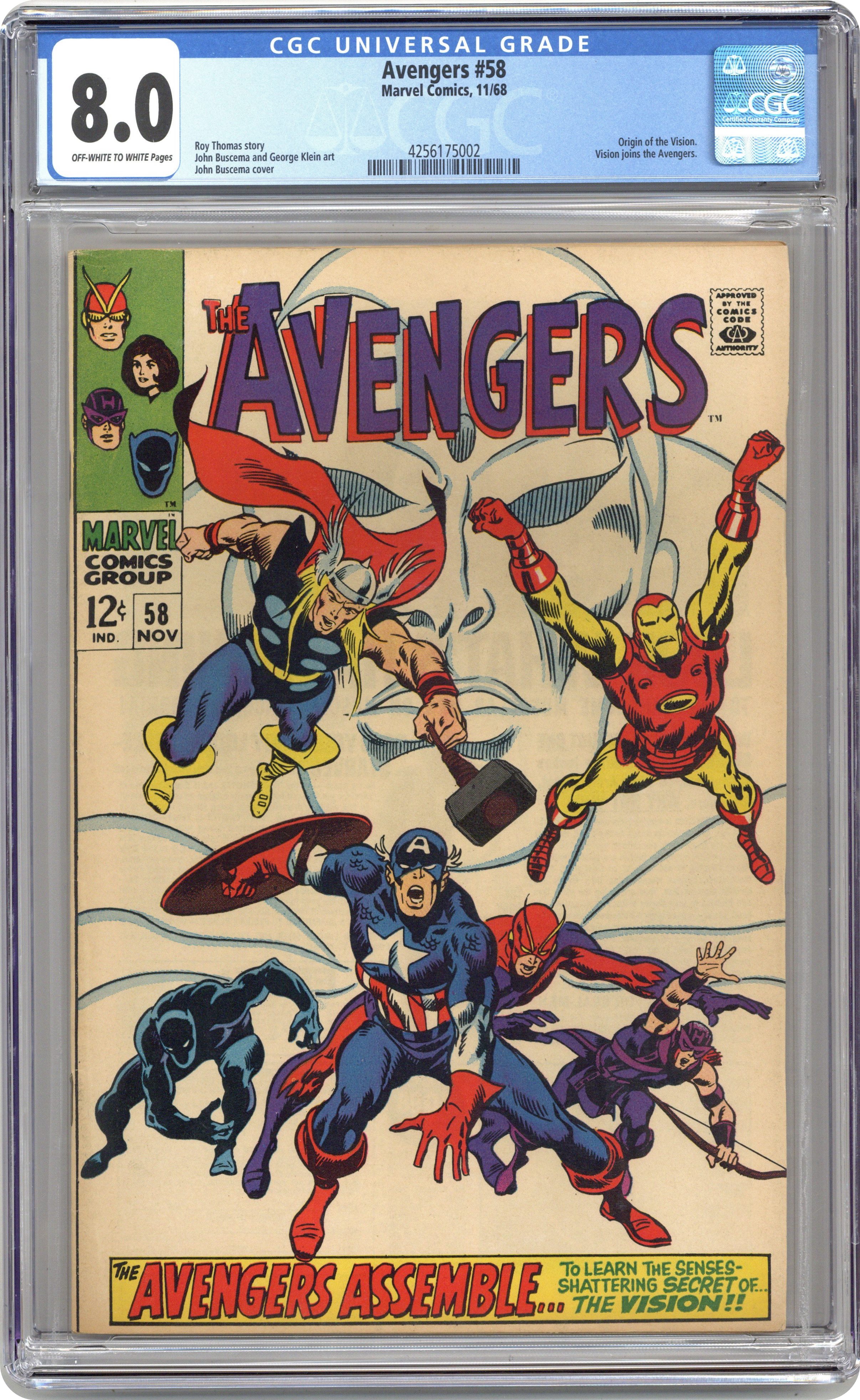 Ended May 6 2024 Winning Bid $89 "Even An Android Can Cry" Part 2 of 2. Origins of the Vision and Ultron. Script by Roy Thomas. Pencils by John Buscema. Inks by George Klein. Cover by John Buscema and George Klein. The Vision wants to become an avenger! But before Goliath and the Wasp can add him to the roster, they must consult the old guard first! When Captain America, Iron Man, and Thor arrive at Avengers Mansion; they test the Vision's powers! And the three stalwarts are suitably impressed! But they also want to know the Vision's background story. Where did he come from and how was he created? As the Vision recounts his earliest memories, Hank Pym begins to connect the dots.Earth's Mightiest Heroes rush to Hank's suburban lab... where they learn the shocking truth about their newest ally: the Vision; and their newest enemy: Ultron! Does the truth clear the way for the Vision to join the Mighty Avengers? An uplifting story! Second appearance of the silver age Vision. Flashback cameos by the Enchantress, Executioner, Baron Zemo, Wonder Man, and Ultron. Avengers Lineup: Black Panther, Captain America, Goliath, Hawkeye, Iron Man, Thor, and the Wasp. (Notes: Roy Thomas and John Buscema's creations of the Vision and Ultron set the stage for decades of great Avengers stories. This issue features a full-page panel (page 9) of all the avengers to date plus Spider-Man. This two-part story was reprinted in 1986 in the Marvel Illustrated paperback: Avengers, The Origin of The Vision. This issue was reprinted in Marvel Super Action #19.) 36 pages. Cover price $0.12. Grade: CGC 8.0 explanation of grade Condition: Used (collectible)
