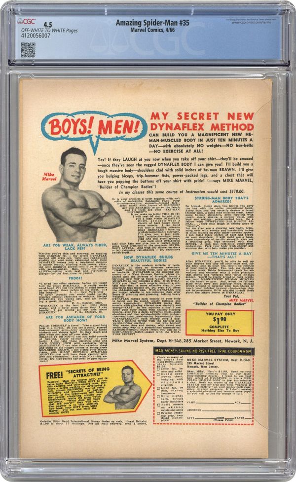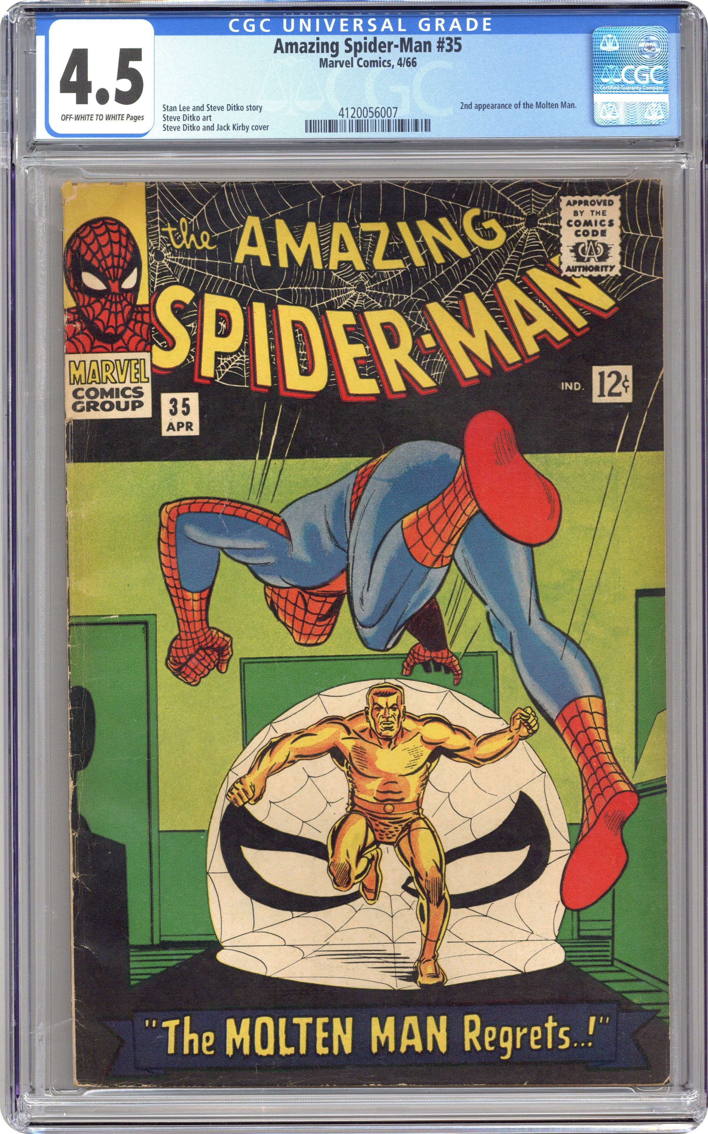 Cover pencils by Steve Ditko and Jack Kirby (Spider-Man figure), inks by Steve Ditko and Sol Brodsky (Spider-Man figure). The Molten Man Regrets...!, script by Steve Ditko (plot) and Stan Lee (script), art by Steve Ditko; The Molten Man is released from jail and he decides he is going to be smarter about his next robbery, but Spider-Man puts an end to his plans. Ad for Hulk T-Shirt and other MMMS items, art by Steve Ditko, Jack Kirby, and Frank Giacoia. Reprinted in Marvel Tales # 28 and 174. 36 pgs., full color. $0.12. Cover price $0.12. Grade: CGC 4.5 explanation of grade Condition: Used (collectible)