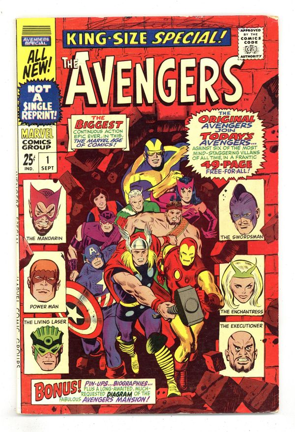 "The Monstrous Master Plan of the Mandarin!" Script by Roy Thomas. Pencils by Don Heck. Inks by George Roussos (as George Bell). Cover by John Buscema and George Roussos (with John Romita touch-ups). The very first Avengers Annual is a blockbuster as the original team of avengers joins with the current team -- to battle six of their greatest foes! The Mandarin returns with a new scheme to conquer the world via a large synthetic diamond. However he needs help to accomplish his goal. So he sends his comrades in arms to three different continents to collect diamonds and wreak havoc! But Earth's Mightiest Heroes stand in their way! In South America Iron Man, Goliath, and the Wasp battle Power Man (aka Erik Josten) and the Swordsman! While in Asia Hercules and the Scarlet Witch clash with the Enchantress and the Executioner! And finally in Africa, Hawkeye and the thunder god face off with the Living Laser! But on the dark continent, the Mandarin has a special surprise waiting: the awesome android called Ultimo! Wow, Thor vs. Ultimo! A battle worth the cover price alone! Eventually, the full contingent of avengers meets the Mandarin inside his orbiting space station for the final showdown! A great annual! Cameo appearances by Jarvis and Nick Fury. Second feature: One-page pin-up of Hercules by Don Heck and George Roussos. Third feature: Two-page diagram of Avengers Mansion. Fourth feature: One-page pin-up of the Black Widow, Scarlet Witch, and Wasp by Don Heck and George Roussos. Fifth feature: One-page pin-up of all the avengers to date. Avengers Lineup: Captain America, Goliath, Hawkeye, Hercules, Iron Man, Quicksilver, Scarlet Witch, Thor, and the Wasp. (Note: This story takes place between Avengers (1st series) #44 and #45.) 68 pages. Cover price $0.25. Grade: VG+ 4.5 explanation of grade Condition: Used (collectible)