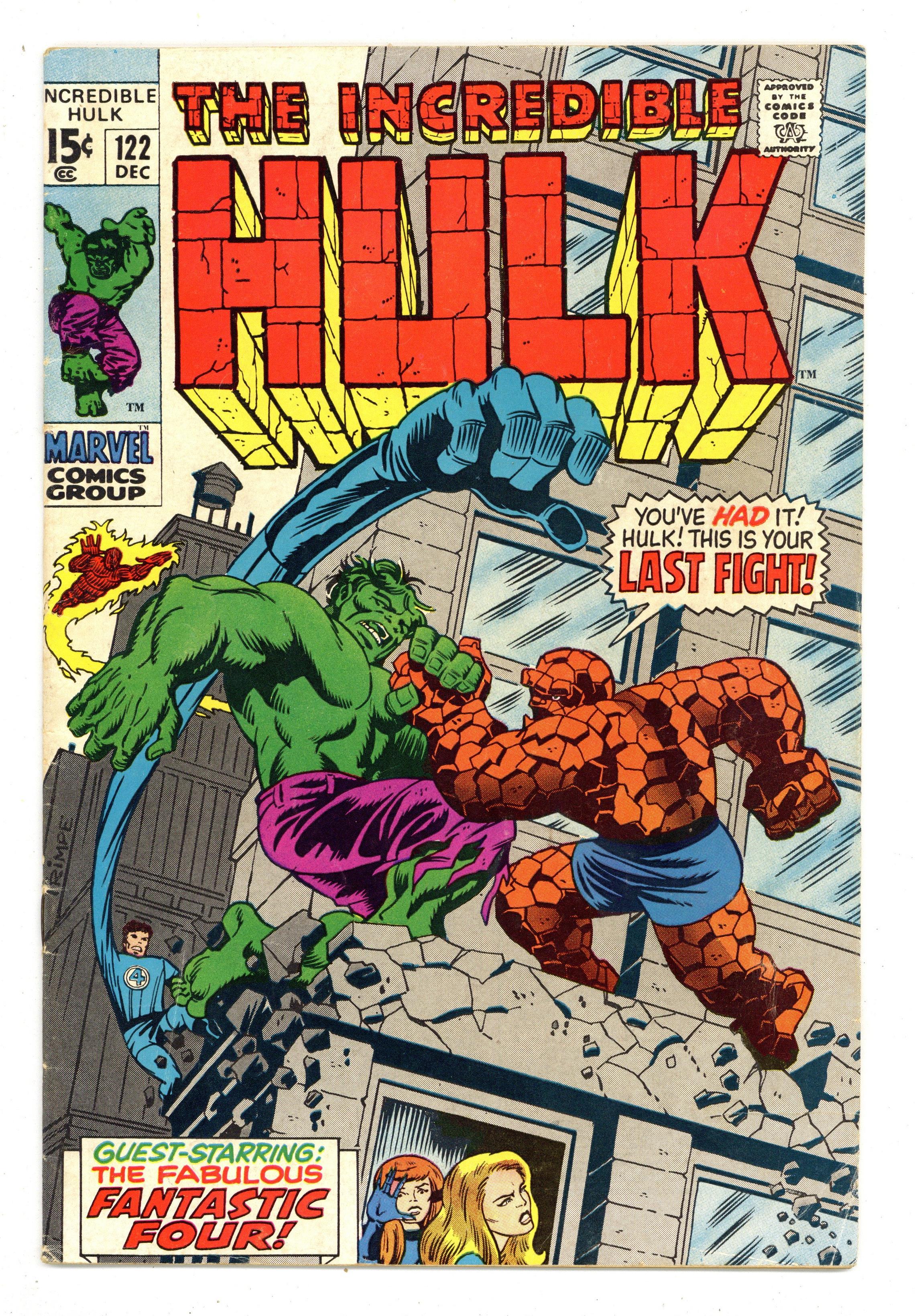 Cover art by Herb Trimpe. The Hulk's Last Fight!, script by Roy Thomas, art by Herb Trimpe; Despairing after he turns into his human alter ego and finds that the Hulk has destroyed a train for no apparent reason, Bruce Banner finds a newspaper headline that asks him to come to New York as Mr. Fantastic believes that he has discovered a way to do away with the Hulk for good; Riding the rails to the Big Apple, Bruce tries to jot some notes of his own regarding Reed's process and secures them to his waist as he finds himself transforming once again into the Hulk to face down some pesky hoboes; By the time he makes it to the Baxter Building, our hero is once again in the form of Bruce Banner but an irate security guard makes his metabolism race and he changes into his monstrous alter ego; During Hulk's battle with the F.F., Sue notices as the pouch with Bruce's notes falls from the Hulk's waist and the Thing is called on to keep the jade giant occupied while Reed uses the new information to modify his weapon design in trying to banish the Hulk for good. 36 pgs. $0.15. Cover price $0.15. Grade: VG- 3.5 explanation of grade Condition: Used (collectible)