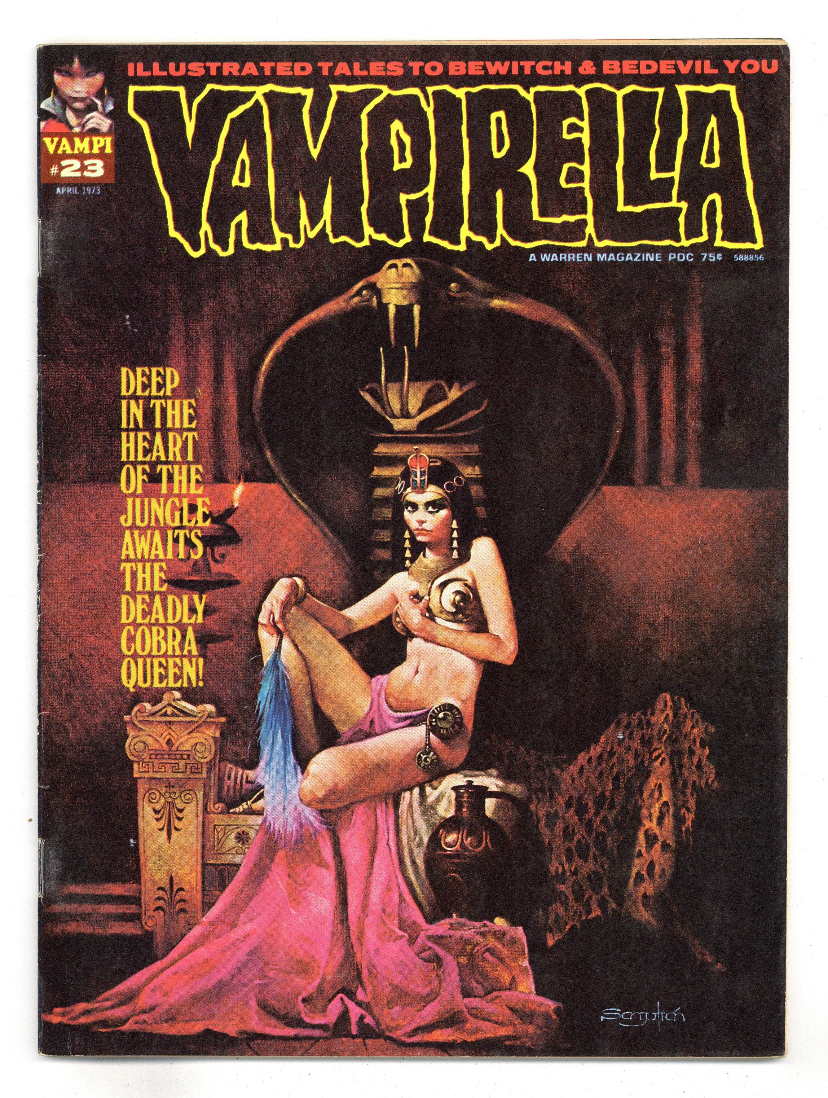 Stories in this issue include: "Queen of Bayou Parish" (starring Vampirella); "Cobra Queen"; "Call it Companionship"; "The Accursed"; "Witch's Promise"; and "Won't Eddie Ever Learn?" Written by Gerry Boudreau, Steve Englehart, Don Glut, Kevin Pagan, Steve Skeates, and Jim Stenstrum. Art by Auraleon, Jose Bea, Jose Gonzalez, Esteban Maroto, Felix Mas, and Ramon Torrents. Cover art by Manuel Sanjulian. Cover price $0.75. Grade: VG/FN 5.0 explanation of grade Condition: Used (collectible)