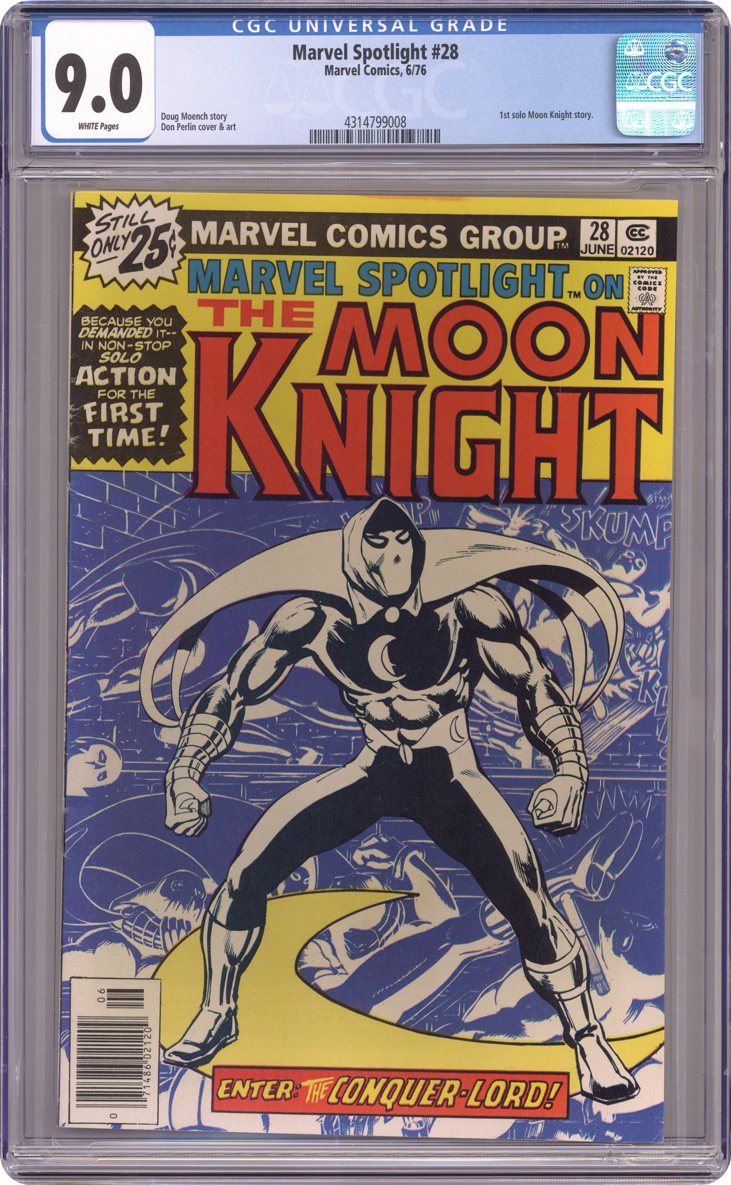 Ended Apr 25 2024 Winning Bid $156 First solo Moon Knight appearance. Cover art by Don Perlin. The Crushing Conquer-Lord!, script by Doug Moench, art by Don Perlin; Moon Night stops seven masked men from breaking into the campaign headquarters for a mayoral prospect named Charles Thurston; Weasel tells Conquer-Lord all about Moon Knight. Letter to the editor from Dean Mullaney (Eclipse Comics). 36 pages, full color. Cover price $0.25. Grade: CGC 9.0 explanation of grade Condition: Used (collectible)