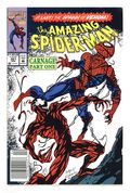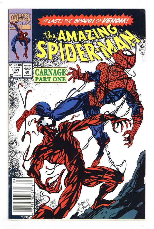 First Printing. Newsstand Edition. First (full) appearance of Carnage in "Savage Genesis!" Part 1 of 3. Script by David Michelinie. Pencils by Mark Bagley. Inks by Randy Emberlin. Cover by Mark Bagley and Randy Emberlin. Blood runs in the streets as a serial killer roams New York City! And as the web-slinger investigates the murders, he notices a very disturbing similarity to another killer's modus operandi! In a burned-out building in Brooklyn, the spectacular one comes face-to-face with his new homicidal foe...Carnage! Can the wall-crawler end Cletus Kasady's rampage in their very first encounter? Cameo appearances by Aunt May and Mary Jane Watson. Flashback cameo by Venom. (Note: This three-part story was reprinted in 2011 in the trade paperback: Spider-Man -- The Vengeance of Venom.) 36 pages, full color. $1.25 cover price. NOTE: Most of these were distributed with slight printer tears in the bottom edge of the cover. Cover price $1.25. Grade: VG 4.0 explanation of grade Condition: Used (collectible)