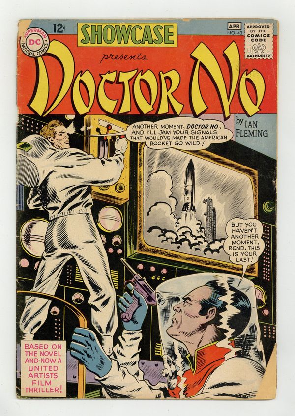 Ended Jan 20 2024 Winning Bid $66 1st Silver Age movie adaptation. Cover art by Bob Brown. Five B&W photos of James Bond and Doctor No. Doctor No, art by Norman J. Nodel; In Jamaica, John Strangways is grabbed by three "blind" beggars; He was checking on "massive interference" with Cape Canaveral rocket launches; Bond goes to Jamaica and zeroes in on Crab Key; He survives fist fights, a tarantula in his bed, gunshots, and being run off the road; Finally, with the help of Honey Ryder and Quarrel, a fisherman, he reaches the island; based on the 1962 feature film. The Man Behind the Typewriter; Background on James Bond and his creator, Ian Fleming. 36 Pages, Full Color. Cover price $0.12. Grade: GD- 1.8 explanation of grade Condition: Used (collectible)