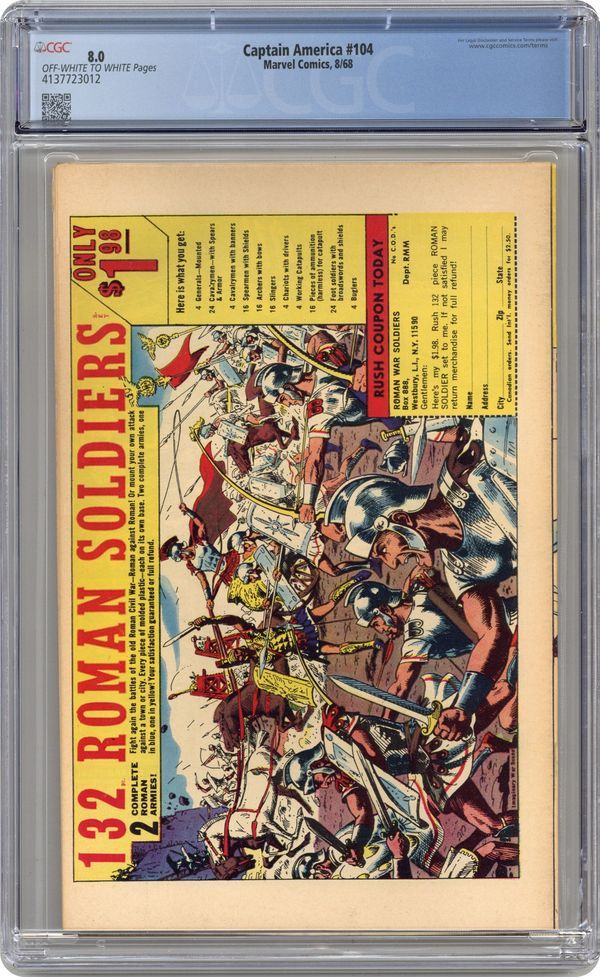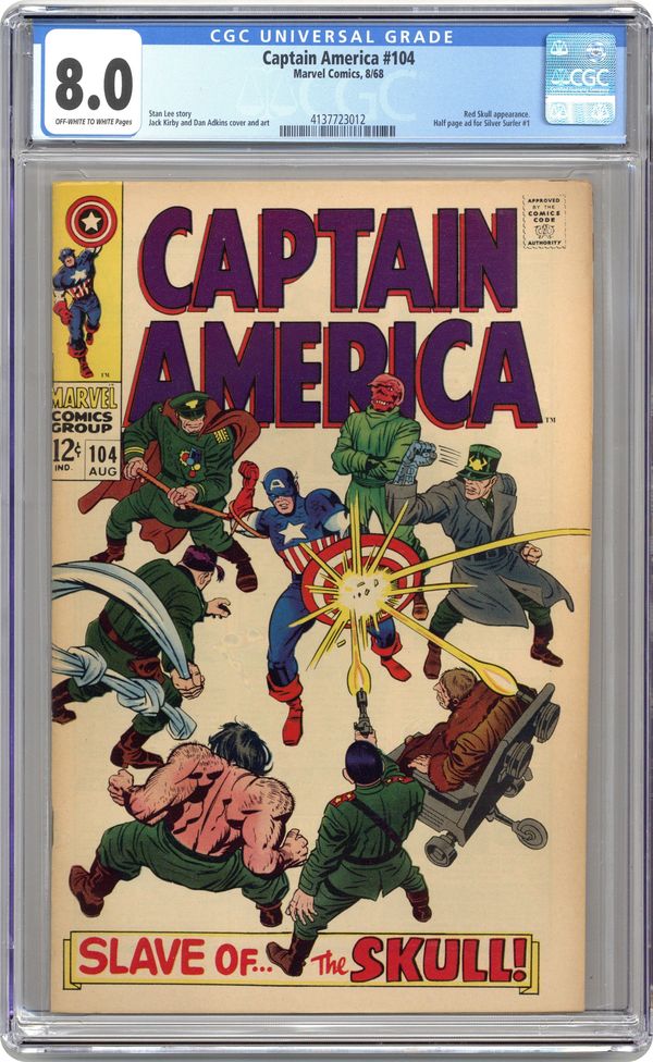 Cover pencils by Jack Kirby, inks by Dan Adkins. "Slave of the Skull!", script by Stan Lee, pencils by Jack Kirby, inks by Dan Adkins and Jim Steranko (p. 11); Shield asks Captain America to test their Life Model Decoys; After Cap easily defeats them, Nick Fury sends them back to the lab; Cap goes to Shields doctor for help with headaches; Red Skull tells Shield he has placed nuclear tape on the back of Captain America's neck; He warns that anyone who tries to remove the special tape would activate the timer on a bomb planted in Washington D.C. by one of the Skull's spies. 36 pgs., full color. $0.12. Cover price $0.12. Grade: CGC 8.0 explanation of grade Condition: Used (collectible)