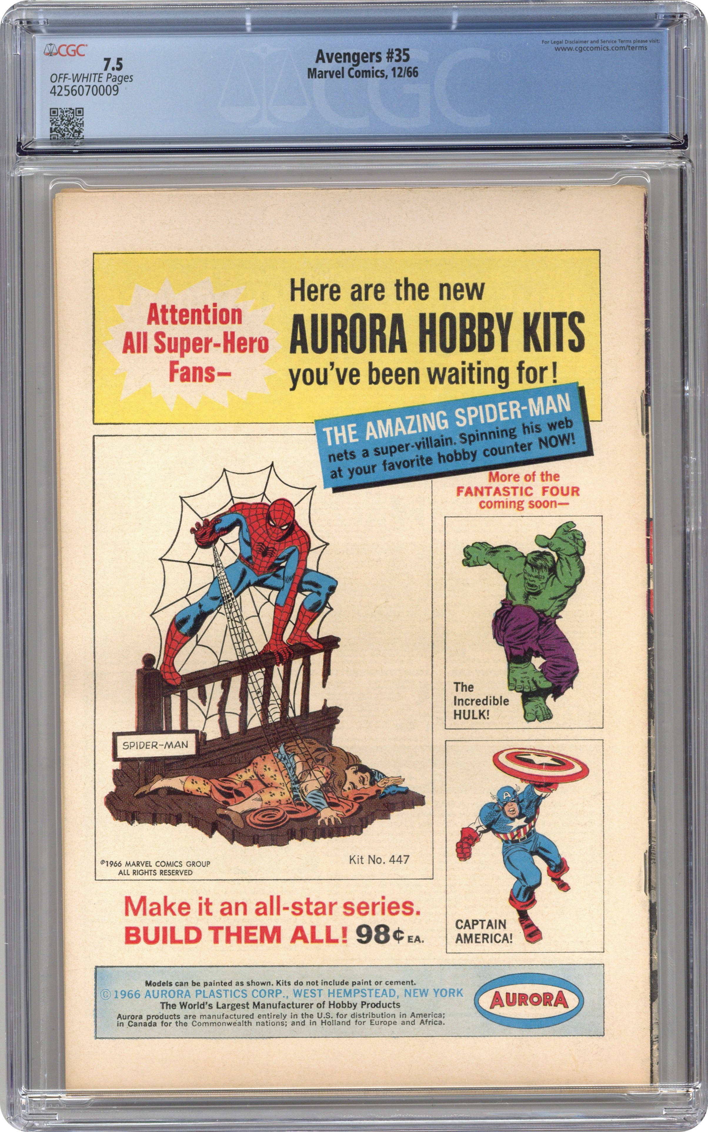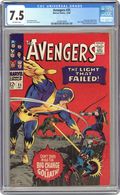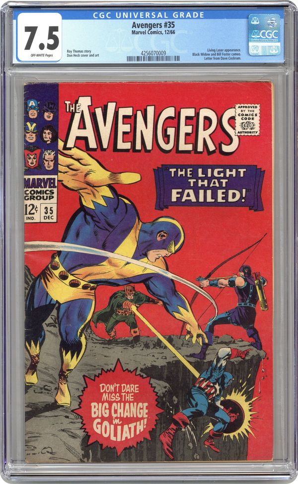 "The Light That Failed!" Part 2 of 2. Plot by Stan Lee and Roy Thomas. Script by Roy Thomas. Art by Don Heck. Cover by Don Heck. The Living Laser has emerged triumphant from his battle against Earth's Mightiest Heroes. And now with the winsome Wasp as his prisoner, the laser-focused villain moves on to his next endeavor! Strangely enough...and for several million dollars, Arthur Parks is going to help overthrow the government of Costa Verde -- a country in Central America. However news of the Living Laser's involvement in Costa Verde's civil war reaches Avengers Mansion! So Cap, Hawkeye, and Goliath know where to find him! When the Avengers arrive south of the border, the non-stop action starts! The Living Laser and his new laser cannon are very formidable. Thus it will take a dangerous gamble by Hank Pym to save the day! Go to the ants! Cameo appearances by Dr. Bill Foster and the Black Widow. (Notes: Jack Kirby and Frank Giacoia contributed the drawing of Captain America to the cover. This issue begins Roy Thomas' five-and-a-half-year run as the writer of the Avengers title. The letters page includes a letter from comics artist Dave Cockrum. This story was reprinted in Marvel Triple Action #27.) 36 pages. Cover price $0.12. Grade: CGC 7.5 explanation of grade Condition: Used (collectible)