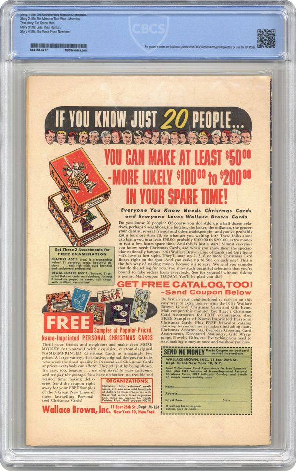 Ended Oct 13 2023 Winning Bid $67 Cover by Jack Kirby and Dick Ayers. The Unbelievable Menace of Moomba Part 1, art by Jack Kirby and Dick Ayers; An explorer discovers that native African wood carvings are actually an advance fifth column invasion force under the command of Moomba. The Menace That Was...Moomba Part 2, art by Jack Kirby and Dick Ayers. The Green Man text story. Less Than Human, art by Don Heck; A strident anti-robot activist is convinced of the worth of robots when his son is saved by his robotic playmate. The Voice from Nowhere, art by Steve Ditko; The space pilot landing on an asteroid is perplexed by a voice from nowhere pleading for help, but he realizes that the asteroid itself is the source of the voice. 36 pgs., full color. $0.10. Cover price $0.10. Grade: CBCS 3.5 explanation of grade Condition: Used (collectible)