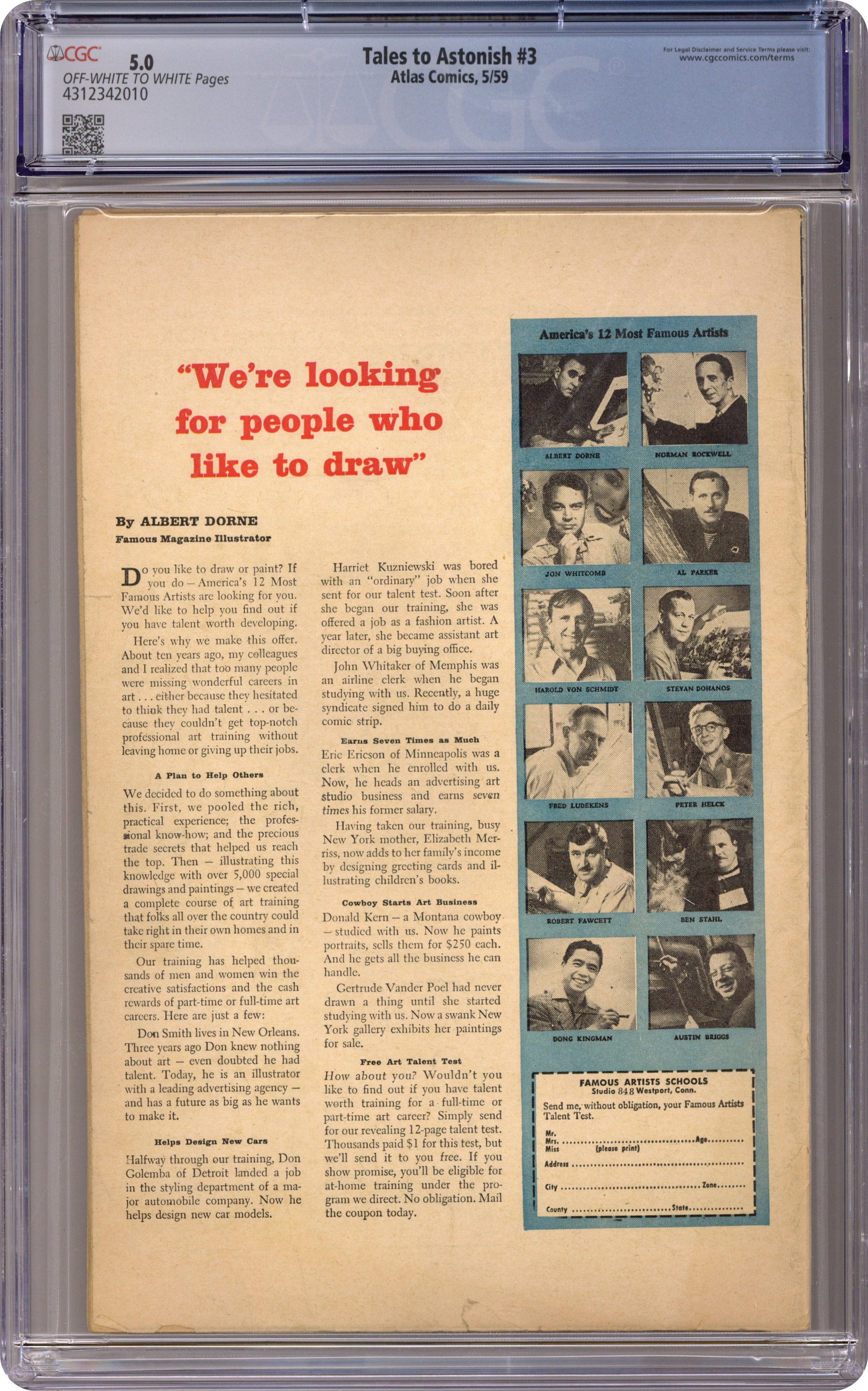 Ended Oct 12 2023 Winning Bid $356 Cover by Jack Kirby and Christopher Rule. I Journeyed Back to the 20th Century!, art by Steve Ditko; A man from 2459 spends all his money building a time machine and so he travels to Fort Knox in 1959 to steal all the gold. The Weatherman text story, art by Joe Maneely. I Discovered the Men from Mars!, art by Joe Sinnott; An American spy spots a Martian ship off the coast, but it turns out to be a Soviet trick. I Found the Perfect Hiding Place in Space!, art by Carl Burgos; A miser in the future hides his money on a remote asteroid. I Am the Giant from Outer Space!, art by Paul Reinman; A space traveller many times larger than everyone else lands and carefully explores the area, accidentally causing some damage and fear. I Escaped to the Stars, art by Bob Forgione. 36 pgs., full color. $0.10. Cover price $0.10. Grade: CGC 5.0 explanation of grade Condition: Used (collectible)