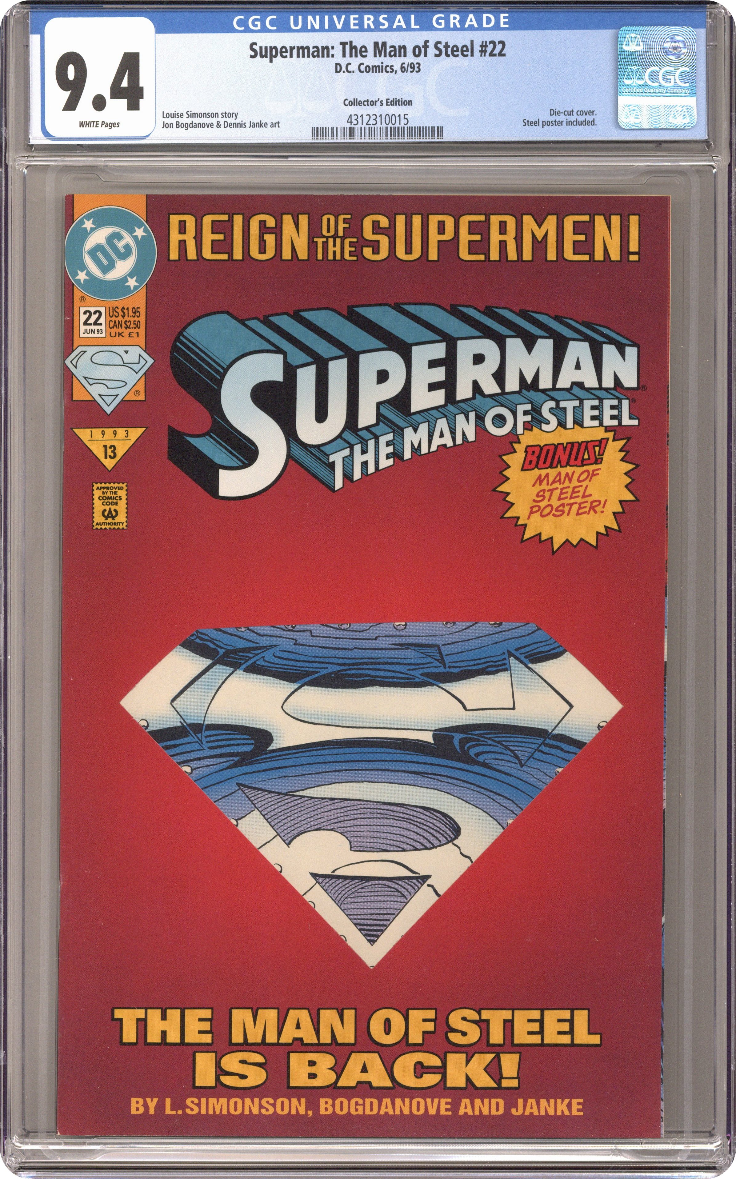Ended Dec 7 2023 Winning Bid $17 #22D special double cover of the Collector's Edition by Jon Bogdanove and Dennis Janke features a unique die-cut design on the outer cover. Beginning the 'Reign of the Supermen,' continued from Adventures of Superman (1939) #500. The Man of Steel returns to Metropolis to quell the latest crime wave in Suicide Slum led by a new, ruthless female crime lord, and Jeb is back in town to see Lois Lane in the wake of Clark Kent's disappearance. Bound into the center of this issue is a double-page miniposter of Superman, printed on cover stock. Written by Louise Simonson, with art by Jon Bogdanove and Dennis Janke. Cover price $1.95. Grade: CGC 9.4 explanation of grade Condition: Used (collectible)