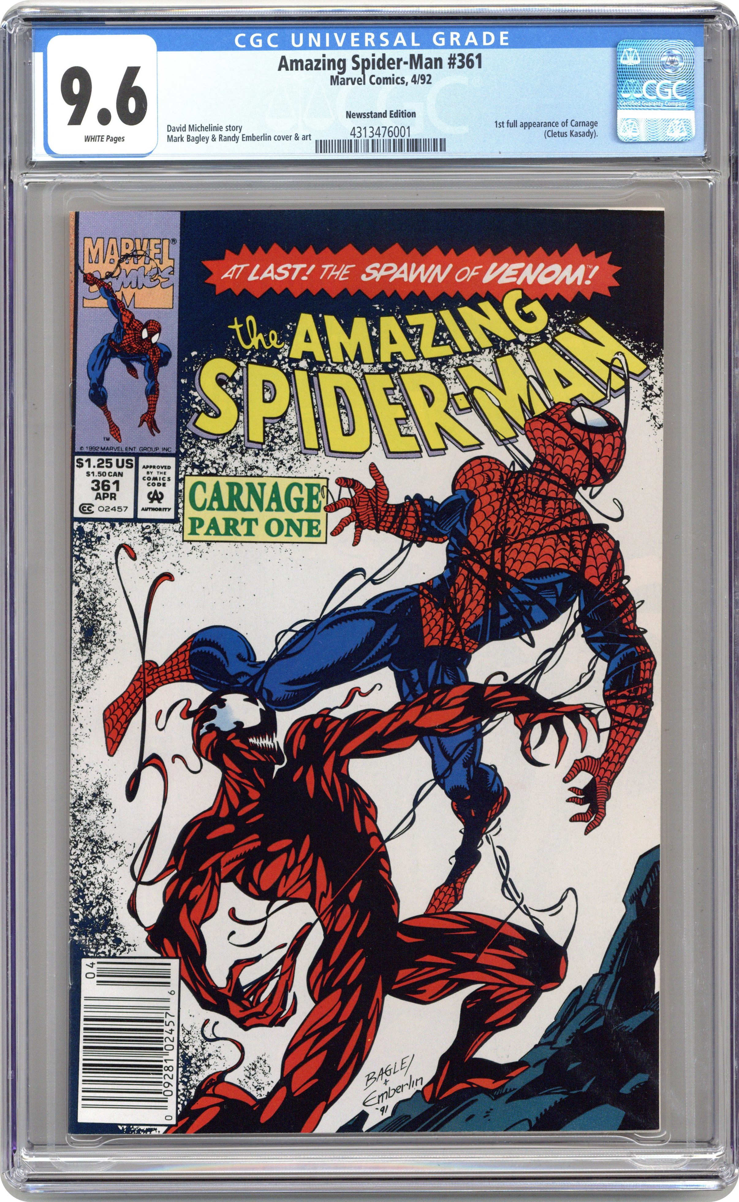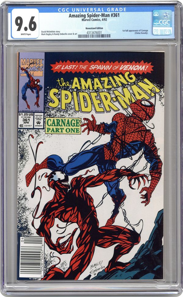 First Printing. Newsstand Edition. First (full) appearance of Carnage in "Savage Genesis!" Part 1 of 3. Script by David Michelinie. Pencils by Mark Bagley. Inks by Randy Emberlin. Cover by Mark Bagley and Randy Emberlin. Blood runs in the streets as a serial killer roams New York City! And as the web-slinger investigates the murders, he notices a very disturbing similarity to another killer's modus operandi! In a burned-out building in Brooklyn, the spectacular one comes face-to-face with his new homicidal foe...Carnage! Can the wall-crawler end Cletus Kasady's rampage in their very first encounter? Cameo appearances by Aunt May and Mary Jane Watson. Flashback cameo by Venom. (Note: This three-part story was reprinted in 2011 in the trade paperback: Spider-Man -- The Vengeance of Venom.) 36 pages, full color. $1.25 cover price. NOTE: Most of these were distributed with slight printer tears in the bottom edge of the cover. Cover price $1.25. Grade: CGC 9.6 explanation of grade Condition: Used (collectible)
