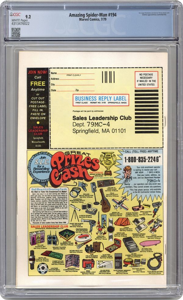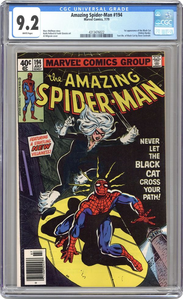 Newsstand Edition. First appearance of the Black Cat in "Never Let The Black Cat Cross Your Path!" Part 1 of 2. Script by Marv Wolfman. Art by Keith Pollard (breakdowns) and Frank Giacoia (finishes). Cover by Al Milgrom. One of the landmark issues of the Amazing Spider-Man series! The dazzling debut of the Black Cat! The wall-crawler has spent the first 193 issues of his title chasing super-villains! But tonight he's going to kiss one instead! Wow! Does the web-slinger stand a chance against the beauty and charm of Felicia Hardy? Not when the alluring cat has his tongue! And maybe later his heart! A terrific issue! Cameo appearances by Aunt May, Betty Brant, Ned Leeds, Harry Osborn, Flash Thompson, Mysterio (in civilian clothes), and the burglar. (Notes: The Black Cat is the creative highlight of the Wolfman-Pollard run on the Amazing Spider-Man title. Dave Cockrum designed the cat's costume. The letters page includes an alternate cover (for issue 194) by Keith Pollard. It also includes an alternate cover to Spider-Woman 9 by Carmine Infantino. This two-part story was reprinted in the trade paperback: Spider-Man vs. the Black Cat (2005). 36 pages, full color. Cover price $0.40. Grade: CGC 9.2 explanation of grade Condition: Used (collectible)