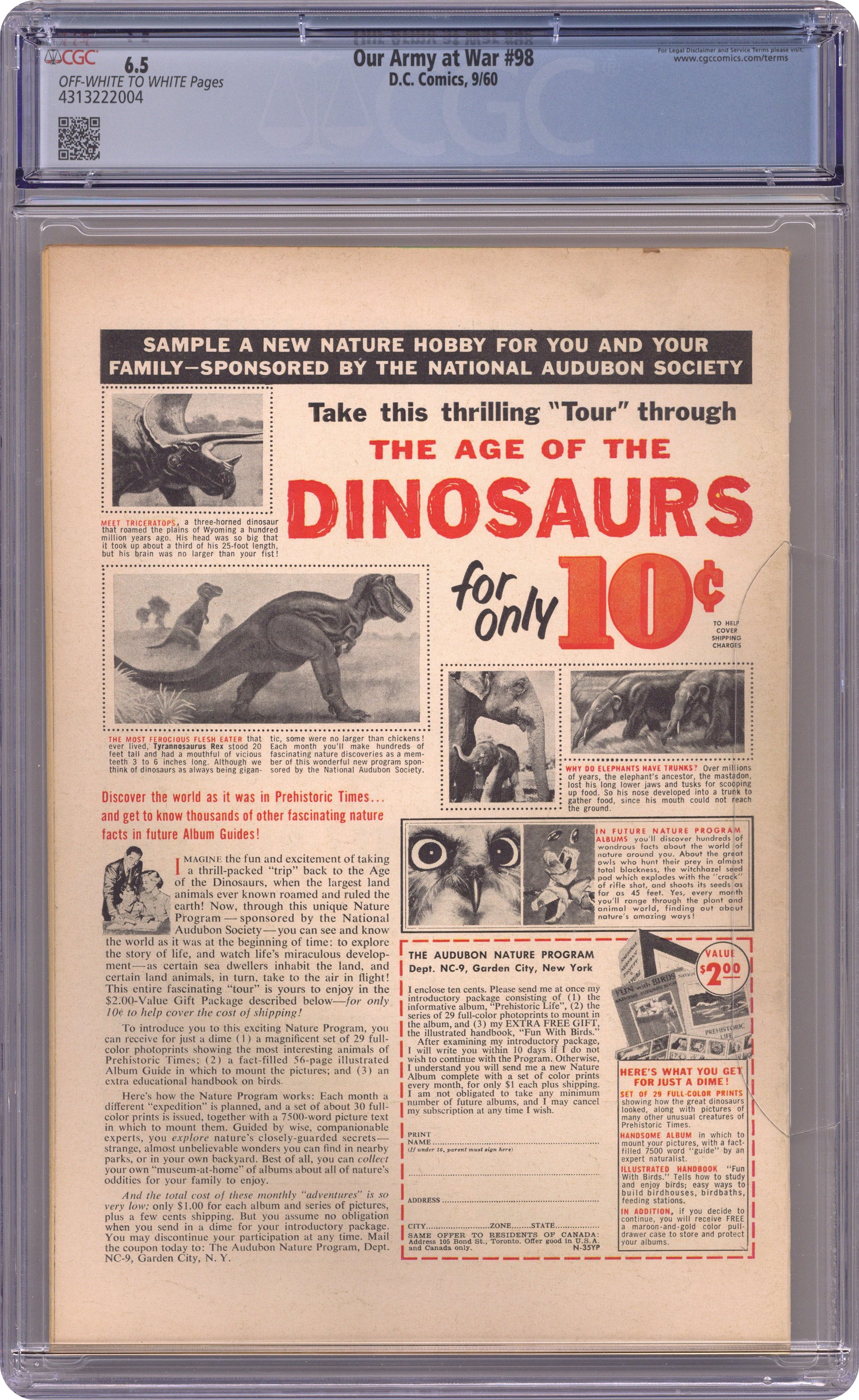 Ended Oct 11 2023 Winning Bid $92 Cover art by Joe Kubert. Soldiers Never Die starring Sgt. Rock, script by Bob Kanigher, art by Joe Kubert. Last Bell For A Jet, script by Bob Haney, pencils by Ross Andru, art by Mike Esposito. A Patrol Lasts Forever, script by Hank Chapman, art by Jack Abel. 36 Pages, Full Color. Cover price $0.10. Grade: CGC 6.5 explanation of grade Condition: Used (collectible)