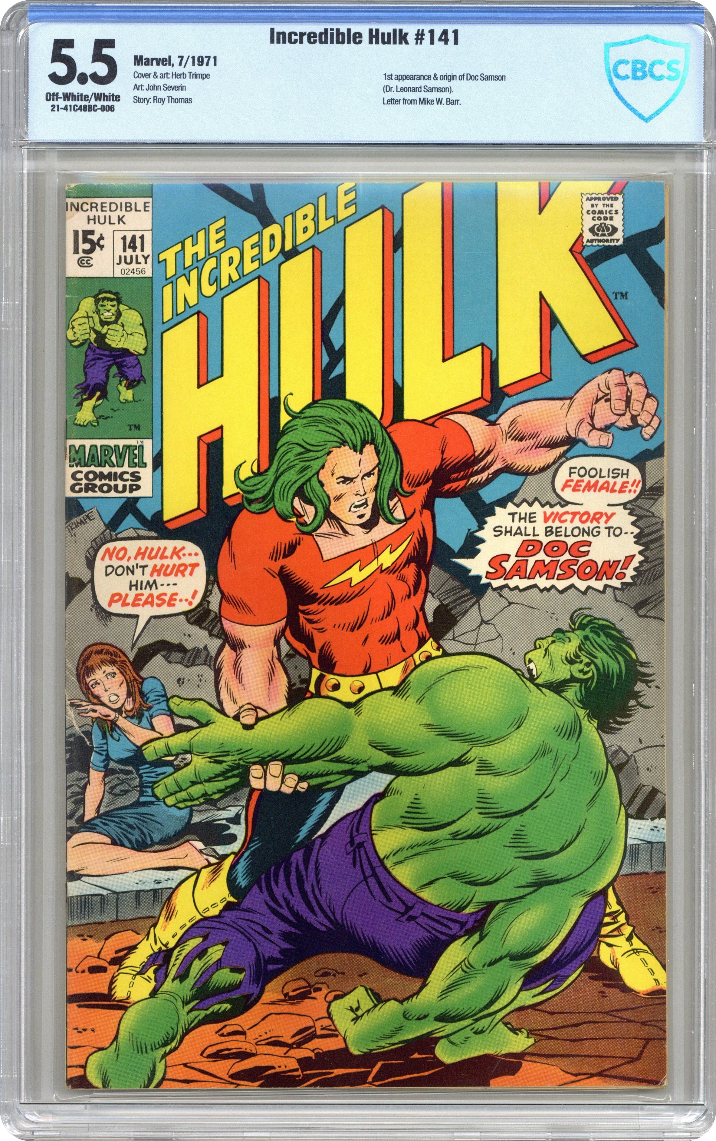 Cover art by Herb Trimpe. His Name Is... Samson!, script by Roy Thomas, pencils by Herb Trimpe, inks by John Severin; Ross enlists the aid of Dr. Samson in siphoning off the Hulk's power to revert Betty from her crystal state and to rid Bruce of the Hulk forever; The experiment is a success, and Leonard uses more of the Hulk's energy to turn himself into a super hero; Watching Doc Samson trying to win Betty's affections, Bruce gets jealous and turns himself into the Hulk once more. House ad for Iron Man #39. 36 pgs. $0.15. Cover price $0.15. Grade: CBCS 5.5 explanation of grade Condition: Used (collectible)