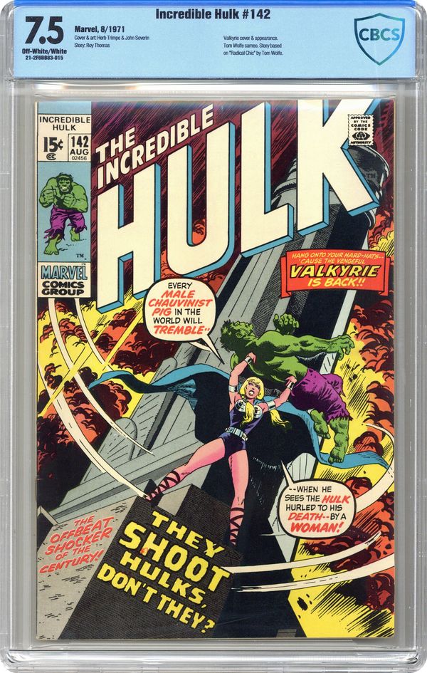 Cover pencils by Herb Trimpe, inks by John Severin. They Shoot Hulks, Don't They?, script by Roy Thomas, pencils by Herb Trimpe, inks by John Severin; The Hulk is the focus of a social event as the Parringtons bring him to a party but their women's lib daughter is given the powers of the Valkyrie by the Enchantress and battles the jade giant. House ad for Conan the Barbarian #8, pencils by Barry Smith. Cameo by author Tom Wolfe. (This story is inspired in part by Wolfe's novel "Radical Chic.") 36 pgs. $0.15. Cover price $0.15. Grade: CBCS 7.5 explanation of grade Condition: Used (collectible)