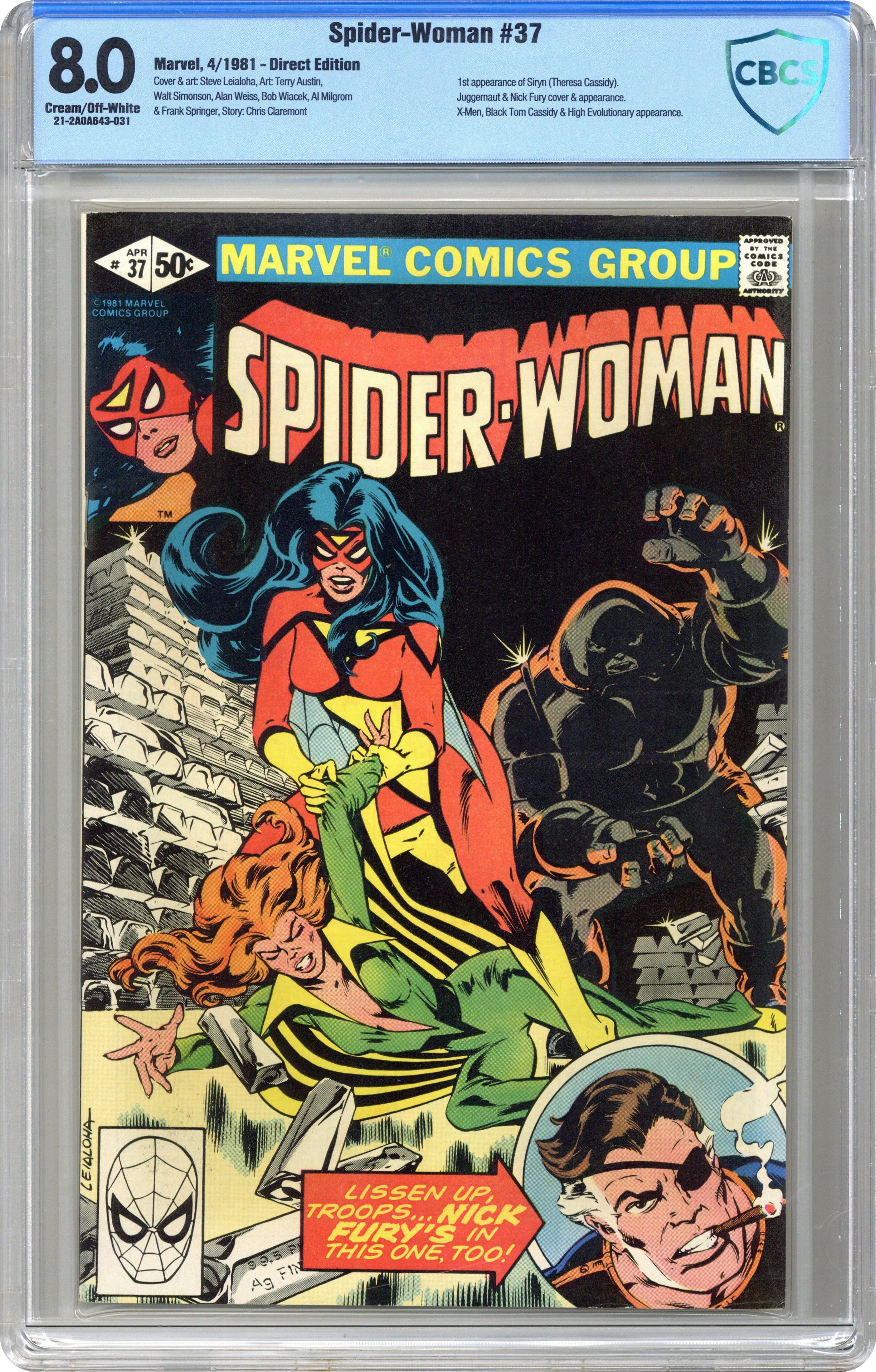 Cover art by Steve Leialoha. Who Am I?, script by Chris Claremont, pencils by Steve Leialoha (layouts) and Terry Austin (finished art), inks by Terry Austin (pages 1-6), Bob Wiacek (pages 7-11, 28-30), Alan Weiss (page 12), Al Milgrom (page 14), and Frank Springer (pages 15-19); Spider-Woman finds herself up against Juggernaut, Black Tom and Tom's niece, Siryn, as they try to steal a government cache of vibranium. 36 pgs. $0.50. Cover price $0.50. Grade: CBCS 8.0 explanation of grade Condition: Used (collectible)