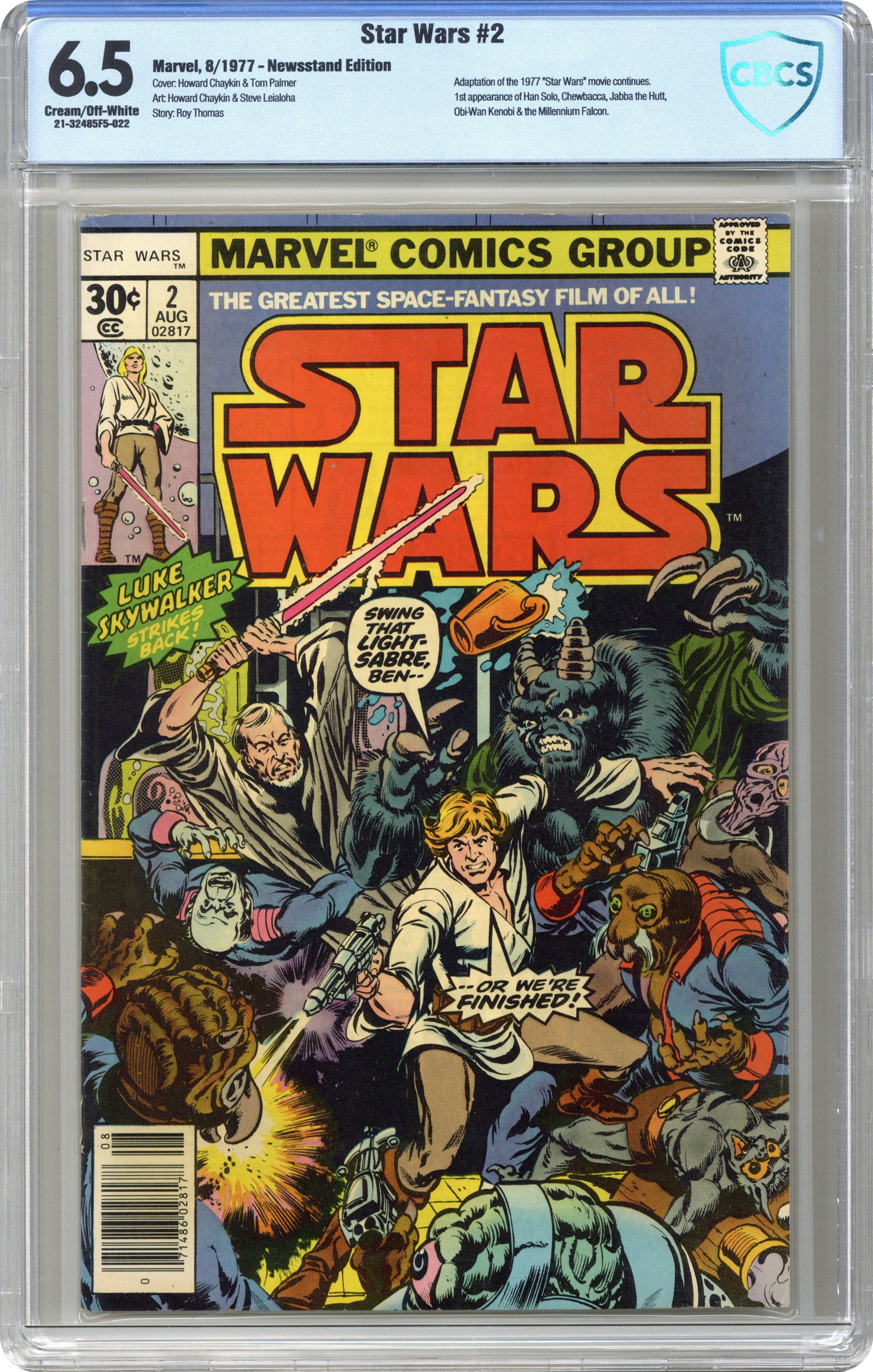 1st printing, standard 30 Cent Newsstand Edition with UPC. A New Hope: Part 2 of 6. "Six against the Galaxy!" Based on the screenplay by George Lucas. Adapted by Roy Thomas. Art by Howard Chaykin and Steve Leialoha. Princess Leia is in the hands of the evil Empire and the sinister Darth Vader. Now it falls on farm boy Luke Skywalker to seize his destiny and rescue her, and save the galaxy. But he can't do it alone. Luckily he'll get some help from old Ben Kenobi, once a great Jedi Knight known as Obi-Wan, Han Solo, a cocky ace pilot and all around scoundrel, Chewbacca, the hulking wookie and loyal co-pilot to Han, and the droids who hold the key to the Empire's defeat, C-3PO and R2-D2. NOTE: Spider-Man stas in a one-page Hostess ad, "Madam Web!" Cover price $0.30. Grade: CBCS 6.5 explanation of grade Condition: Used (collectible)