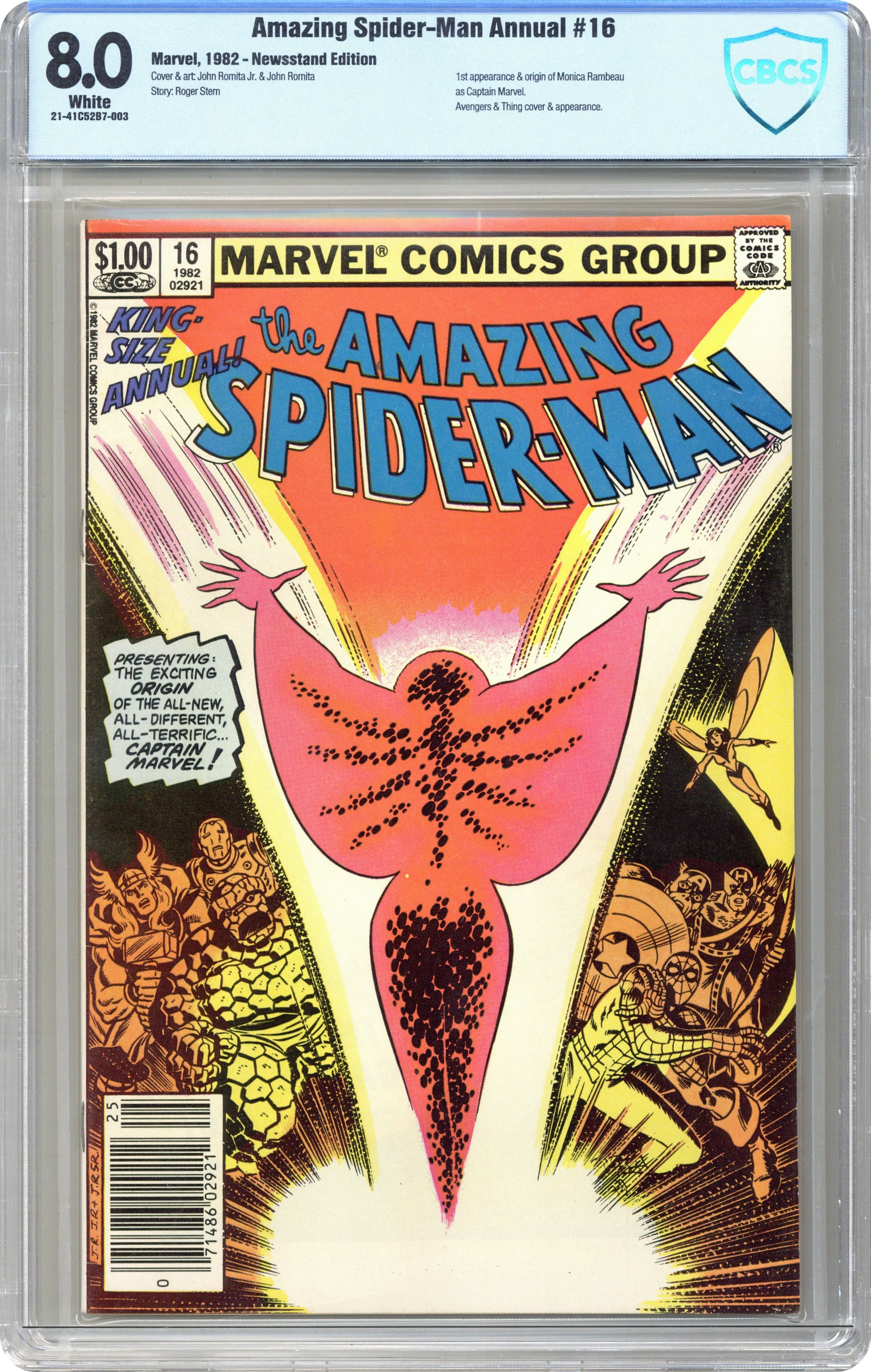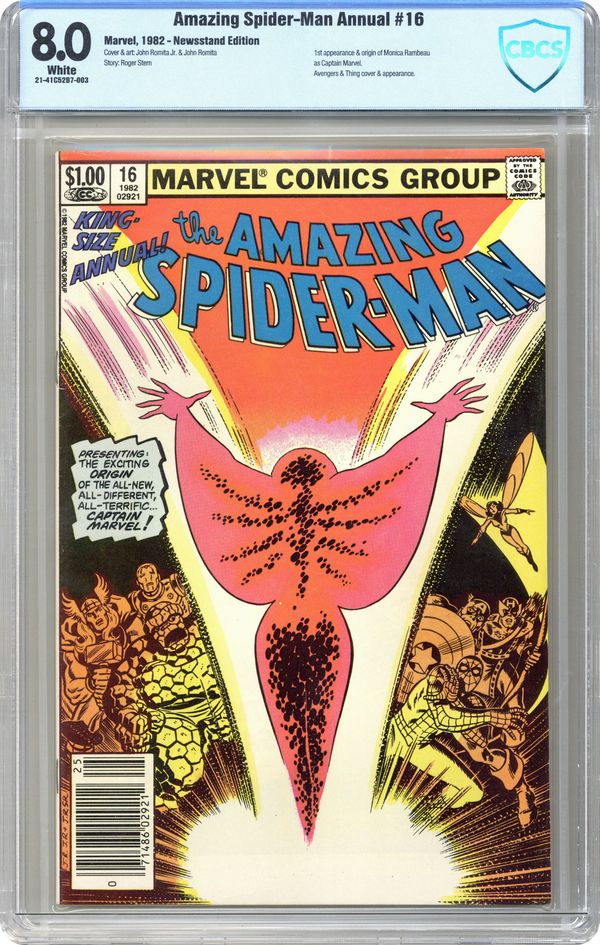 Direct Edition. "Who's That Lady?" First appearance of the second Captain Marvel, Monica Rambeau. Guest-starring the Avengers and the Thing. Script by Roger Stern. Art by John Romita Jr. (breakdowns) and John Romita Sr. (finishes). Cover by John Romita Jr. and John Romita Sr. It's the dazzling debut of the new Captain Marvel (aka Monica Rambeau)! After gaining her powers in a freak accident on an offshore oil rig, the New Orleans native needs help controlling her awesome new abilities! Monica travels to New York City in hopes of finding the Fantastic Four! But she bumps into the Spectacular Spider-Man first! After eluding the web-slinger, Captain Marvel zooms to the Baxter Building! However, Ben Grimm can only offer moral support, so he sends the distressed captain to Avengers Mansion! Once there Shell-head and the Wasp attempt to stabilize Captain Marvel's runaway powers, but the wall-crawler inadvertently interferes! Is the new Captain Marvel's superhero career going to be over...before it even starts? Cameo appearances by Harry Osborn and Liz (Allan) Osborn. Avengers Lineup: Captain America, Hawkeye, Iron Man, She-Hulk, Thor, and the Wasp. First backup feature: "The Many Loves of Peter Parker" One-page breakdown of the various loves of Peter Parker's life. Second backup feature: "The Daily Bugle" One-page illustration of the cast of characters at the Daily Bugle. (Note: Captain Marvel appears next in Avengers 227.) 52 pages. Cover price $1.00. Grade: CBCS 8.0 explanation of grade Condition: Used (collectible)