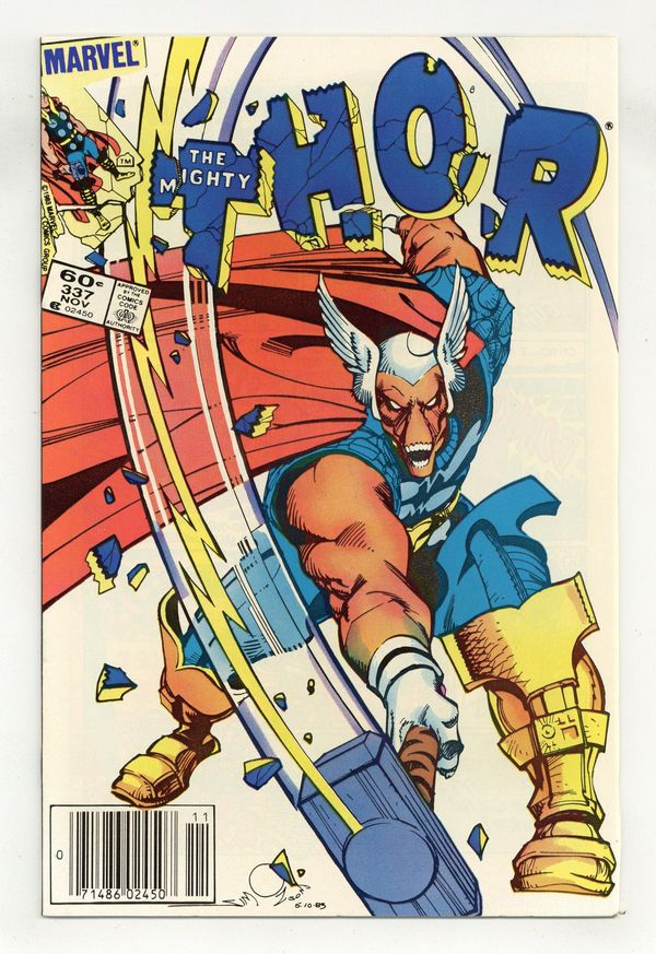 Newsstand Edition. Cover by Walt Simonson. Beta Ray Bill (first appearance) becomes Thor in "Doom!", script and art by Walt Simonson; Nick Fury asks Thor's aid in investigating an alien ship heading for earth; Thor arrives and triggers the awakening of an alien protector, Beta Ray Bill; Bill bests Thor and takes up his hammer only to be accidentally summoned to Asgard by Odin who thinks he is summoning Thor. Brief appearances by Nick Fury, Loki, Sif, Balder, Heimdall, Volstagg, and Odin. First appearance of Lorelei (sister of the Enchantress). Begins Walt Simonson's run on Thor (through #382). Bullpen Bulletins. Star Frontiers TSR ad. 36 pgs., full color. $0.60. Cover price $0.60. Grade: VF 8.0 explanation of grade Condition: Used (collectible)