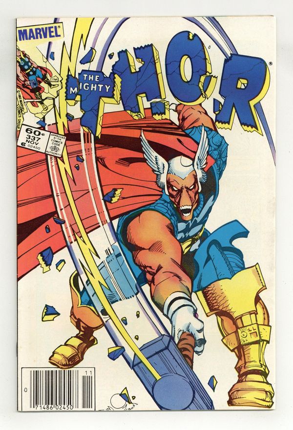 Newsstand Edition. Cover by Walt Simonson. Beta Ray Bill (first appearance) becomes Thor in "Doom!", script and art by Walt Simonson; Nick Fury asks Thor's aid in investigating an alien ship heading for earth; Thor arrives and triggers the awakening of an alien protector, Beta Ray Bill; Bill bests Thor and takes up his hammer only to be accidentally summoned to Asgard by Odin who thinks he is summoning Thor. Brief appearances by Nick Fury, Loki, Sif, Balder, Heimdall, Volstagg, and Odin. First appearance of Lorelei (sister of the Enchantress). Begins Walt Simonson's run on Thor (through #382). Bullpen Bulletins. Star Frontiers TSR ad. 36 pgs., full color. $0.60. Cover price $0.60. Grade: FN/VF 7.0 explanation of grade Condition: Used (collectible)