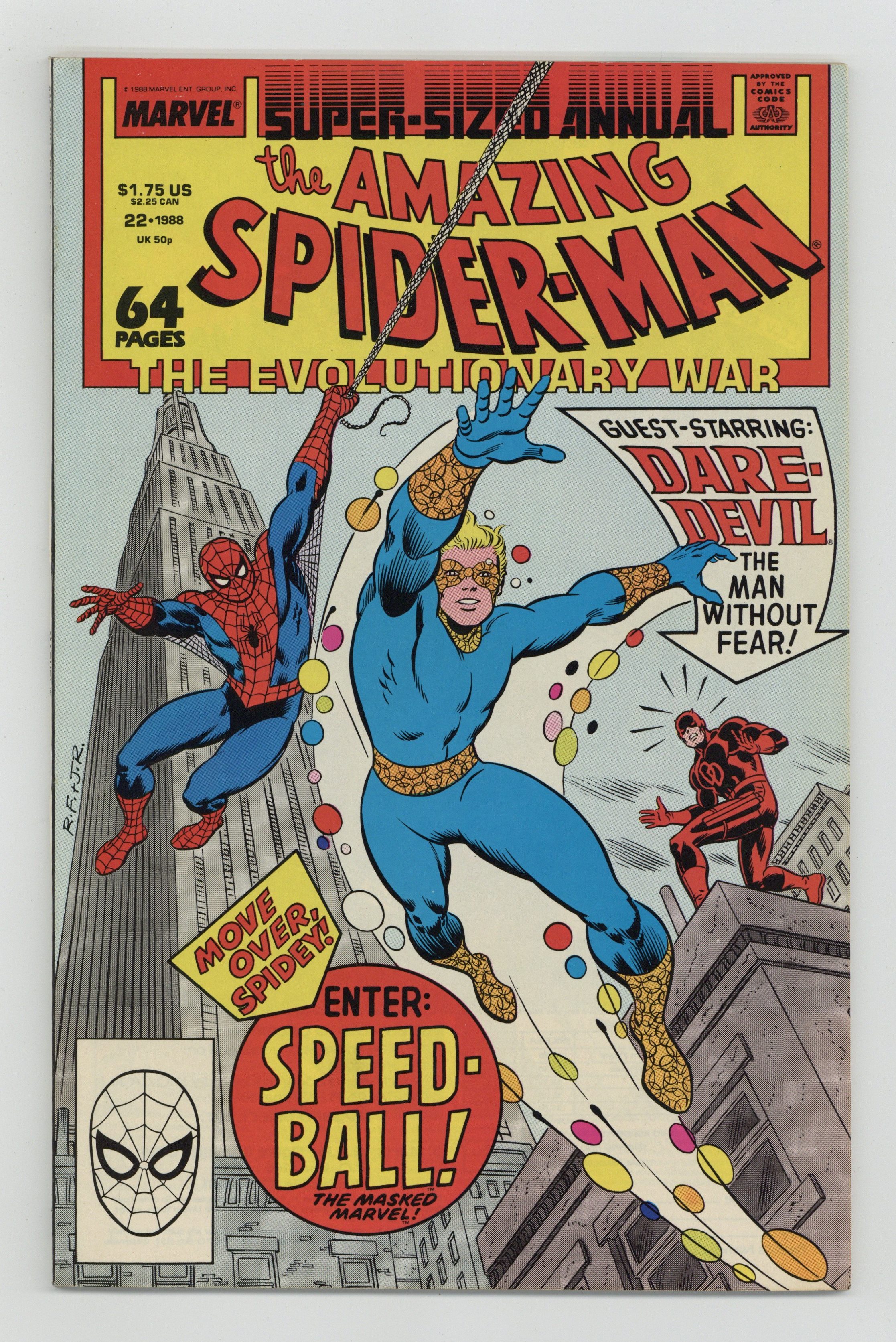 Ended Dec 19 2023 Winning Bid $14 "Drug War Rages" Guest-starring Daredevil and Speedball. Part 5 of the Evolutionary War storyline. First appearance of Speedball. Plot by Tom DeFalco. Script by David Michelinie. Pencils by Mark Bagley. Inks by Mike Esposito. Cover by Ron Frenz and Joe Rubinstein. What begins as a simple drug bust in a west side warehouse...escalates into a battle atop the Empire State Building to save the lives of everyone in the Big Apple! Along the way the Amazing Spider-Man teams up with a familiar ally, the Man Without Fear; and meets a new superhero: Speedball (aka Robbie Baldwin)! The High Evolutionary wants to sterilize New York's population to eradicate DNA strands deemed to be undesirable! Can the web-slinger, Daredevil, and Speedball defeat the Purifiers and maintain the gene pool status quo? The Evolutionary War storyline continues in Fantastic Four Annual 21. Appearances by the Kingpin, Arranger, Madeline Naylor, Mary Jane Watson, Ben Urich, and J. Jonah Jameson. First backup story: "He Who Laughs..." Plot by Steve Ditko. Script by Roger Stern. Pencils by Steve Ditko. Inks by Jackson Guice. Speedball battles a crazy stagehand seeking revenge against his mother. Second backup story: "Kindred Spirits" Story by Mark Gruenwald. Pencils by Ron Lim. Inks by Tony DeZuniga. Chapter 6 of the High Evolutionary's history. Inside his Wundagore Mountain citadel, Edgar Wyndham creates Bova -- the future nanny of Quicksilver and the Scarlet Witch; and foolishly ignores Magnus' warning that the spirit of Chthon is bound to Wundagore Mountain. First backup feature: Spider-Man and J. Jonah Jameson pin-up by Larry Lieber and Frank Giacoia. Second backup feature: 2-page diagram of Peter and Mary Jane's Bedford Towers apartment. Third backup feature: Two unpublished Amazing Spider-Man covers -- the first by Larry Lieber & Jack Abel; the second by Bob Layton. (Note: Fantastic Four Annual 21 is the 6th part of the Evolutionary War storyline, but the 5th chapter of the history presented in the backup stories.) 68 pages. Cover price $1.75. Grade: VF 8.0 explanation of grade Condition: Used (collectible)