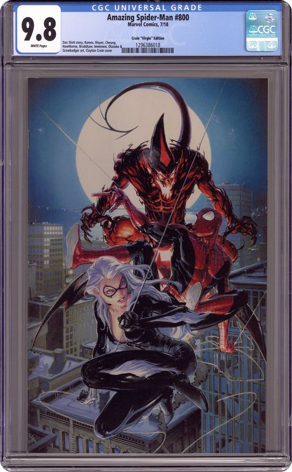 Ended Oct 28 2023 Winning Bid $47 ComicXposure exclusive virgin cover by Clayton Crain. Go Down Swinging: Part 4 of 4 - Written by Dan Slott. Art by Nick Bradshaw, Humberto Ramos, Guiseppe Camuconli, Stuart Immonen, Marcos Martin, Victor Olazaba, Cam Smith and Wade Von Grawbadger. Dan Slott and Stuart Immomen are joined by many of the artists who made the last 10 years of Spider-Man so Amazing! The biggest Peter Parker/Norman Osborn story of all time unfolds over one 80-page story, a scope unmatched in comics! Who lives?! Who dies?! And what scars will Spider-Man bear from here on out?! 92 pages,full color. Rated T Grade: CGC 9.8 explanation of grade Condition: Used (collectible)