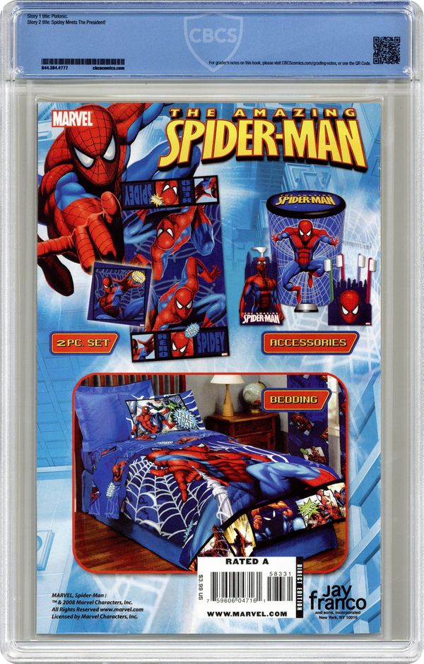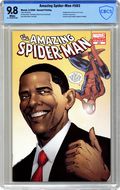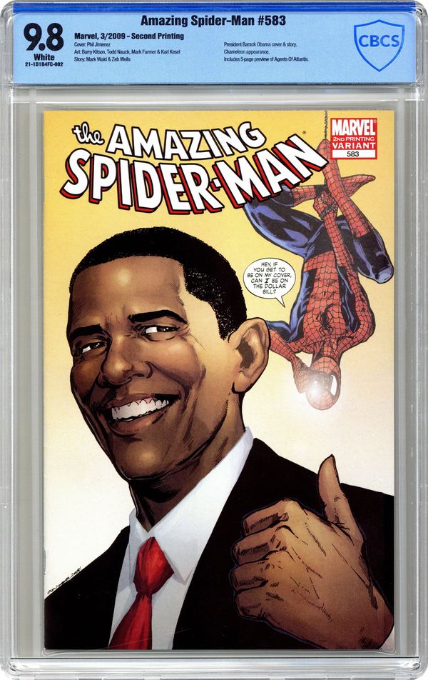 2ND PRINTING - Special Obama Variant Cover of Amazing Spider-Man! Spidey meets President Barack Obama - Written by MARK WAID, Pencils by BARRY KITSON, Cover by PHIL JIMENEZ. YOU ASKED FOR IT, YOU GOT IT! PETER PARKER ON A DATE! After the revelations of 'Mind on Fire', love is in the air for more than one member of the cast and Pete finally gets some time out with the ladies. (and who better to bring it to you than two men who both had dates as recently as 1987!) Amidst the romance though, forces are gathering that will spell trouble for Peter in the months to come. From Marvel Comics. Also to celebrate the inauguration of Barack Obama, Marvel proudly presents this new printing of Amazing Spider-Man #583 with an all-new bonus story teaming one of the world's most recognizable political figures with the world's greatest super-hero! Written by Zeb Wells with art by Todd Nauck & Frank D'Armata, the new story takes place in Washington, DC on Inauguration Day as one of Spider-Man's oldest foes attempts to thwart the swearing in ceremony of the 44th President of the United States! 44 pgs. Cover price $3.99. Grade: CBCS 9.8 explanation of grade Condition: Used (collectible)